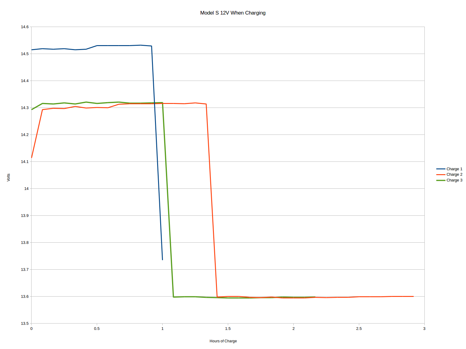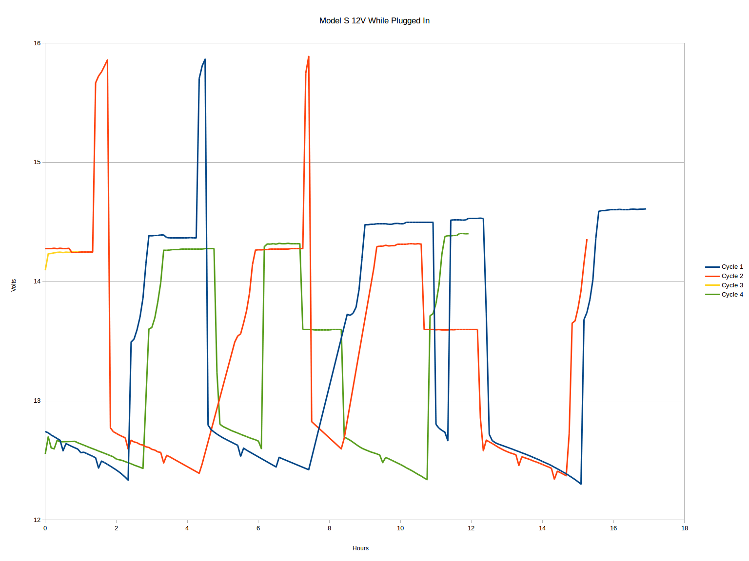 This is quite clear in the red and green lines - the battery is charged at 14.2V for an hour or so, then the car drops back to 13.6V and holds it there for the remainder of the charge. This is a great use of “shore power” - no cycles on the battery. I’m a bit surprised that the higher voltage charge interval is so short, though. Lead acid takes a while to charge.