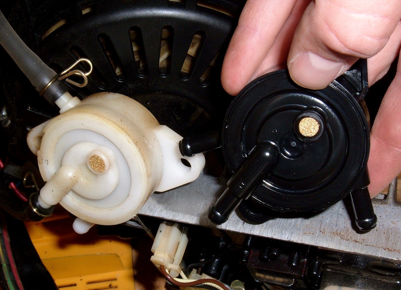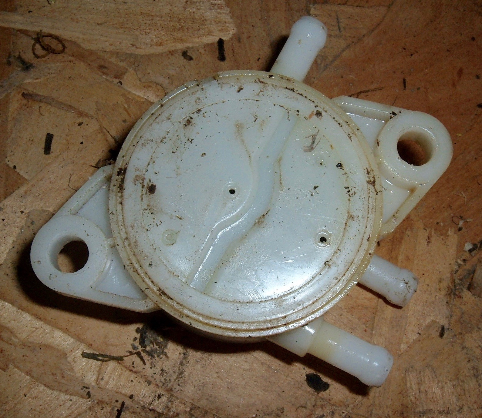 A vacuum fuel pump is a pretty simple gizmo. There’s a diaphram that moves with the pulses from the crankcase (as the piston moves, the crankcase volume changes, so the pressure changes), and a pair of check valves (also usually soft plastic flappers or something). This pumps fuel.