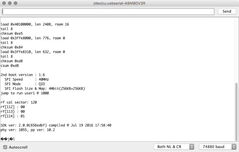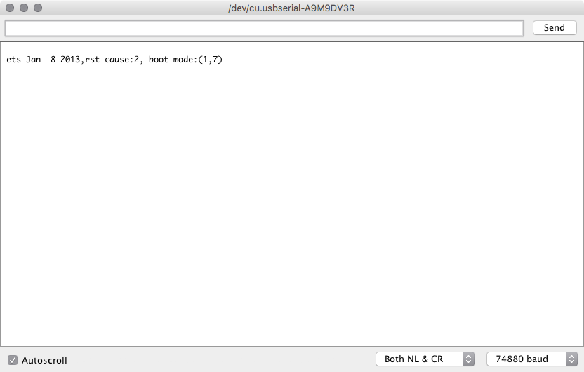 For an initial test, set the baud rate to 74880. Yes, it’s really weird. Yes, it’s useful.