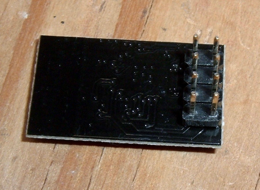 Put the ESP02 in as well. I just soldered header pins on for this. It’s convenient to put the two rows of 4 pins in a breadboard when you’re soldering them on, by the way - a breadboard holds the pins at exactly the right spacing.