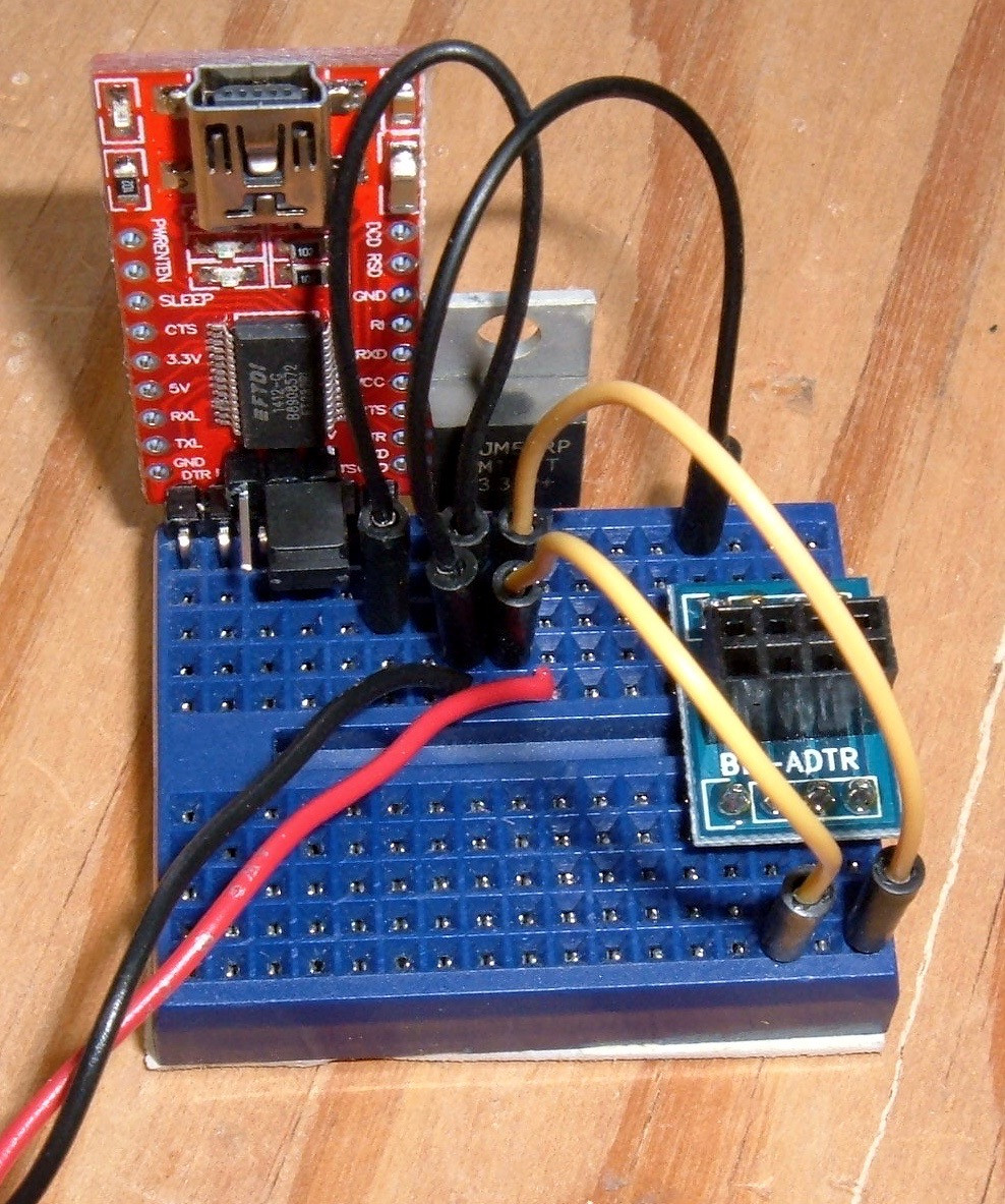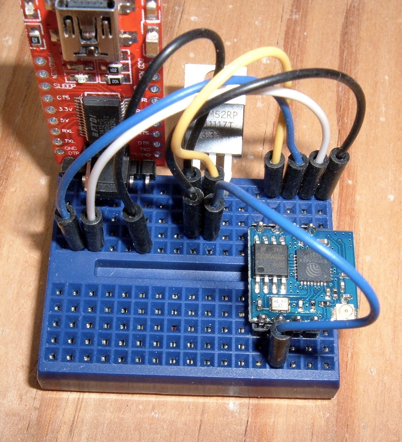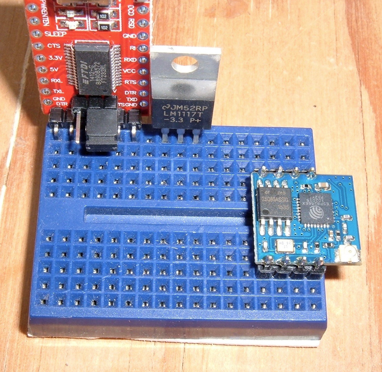 Start the assembly by putting both the FTDI adapter and the voltage regulator in the breadboard. If you’re not familiar with breadboards, each of the vertical rows on either side of the center is connected together - so I can put up to 5 connections on the same row and have them be connected. This also mandates how the parts are aligned - were I to put the regulator in on the left edge, all the pins would be shorted together.