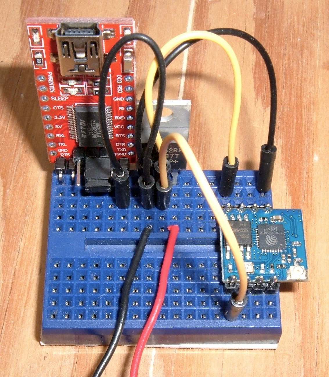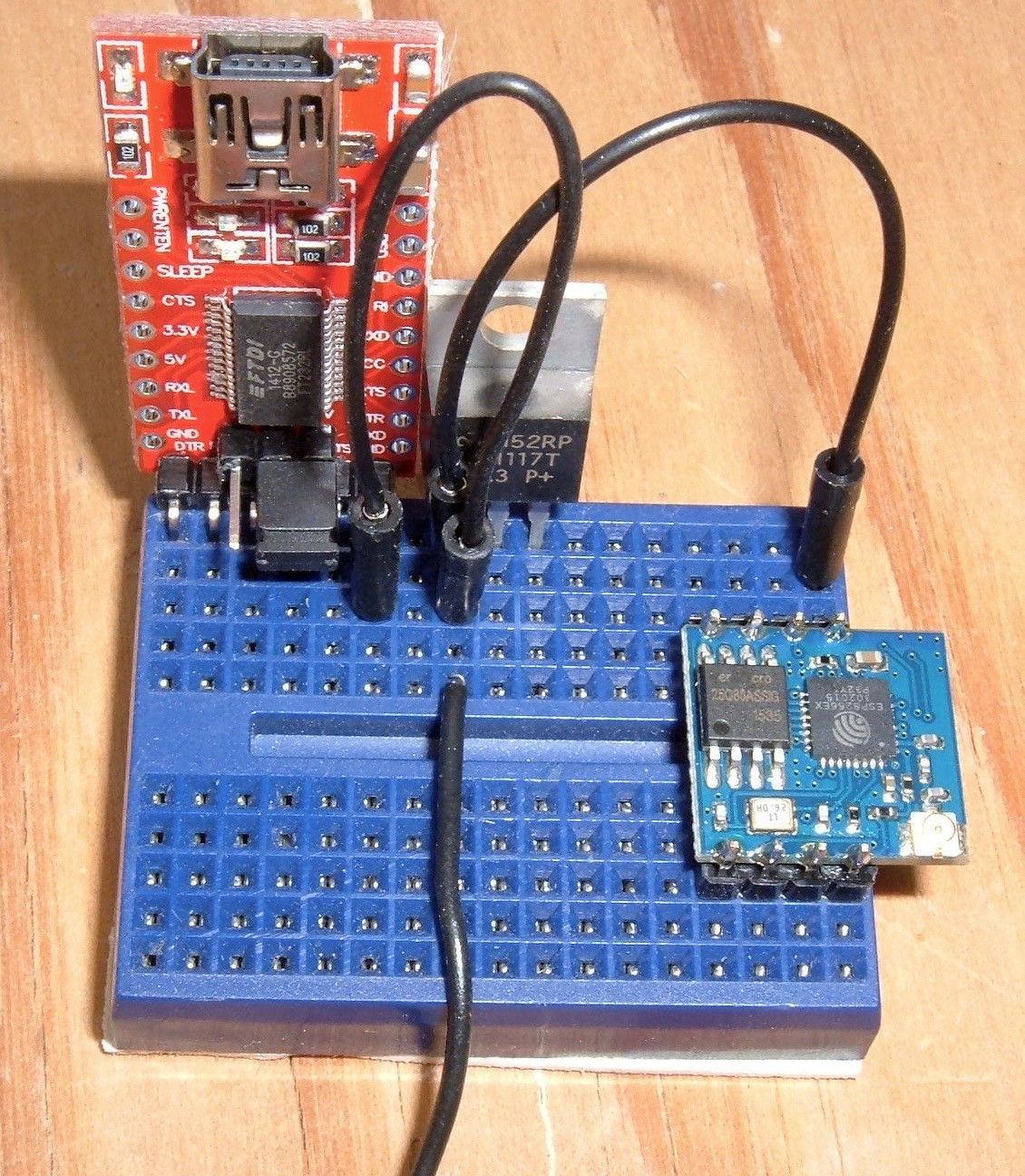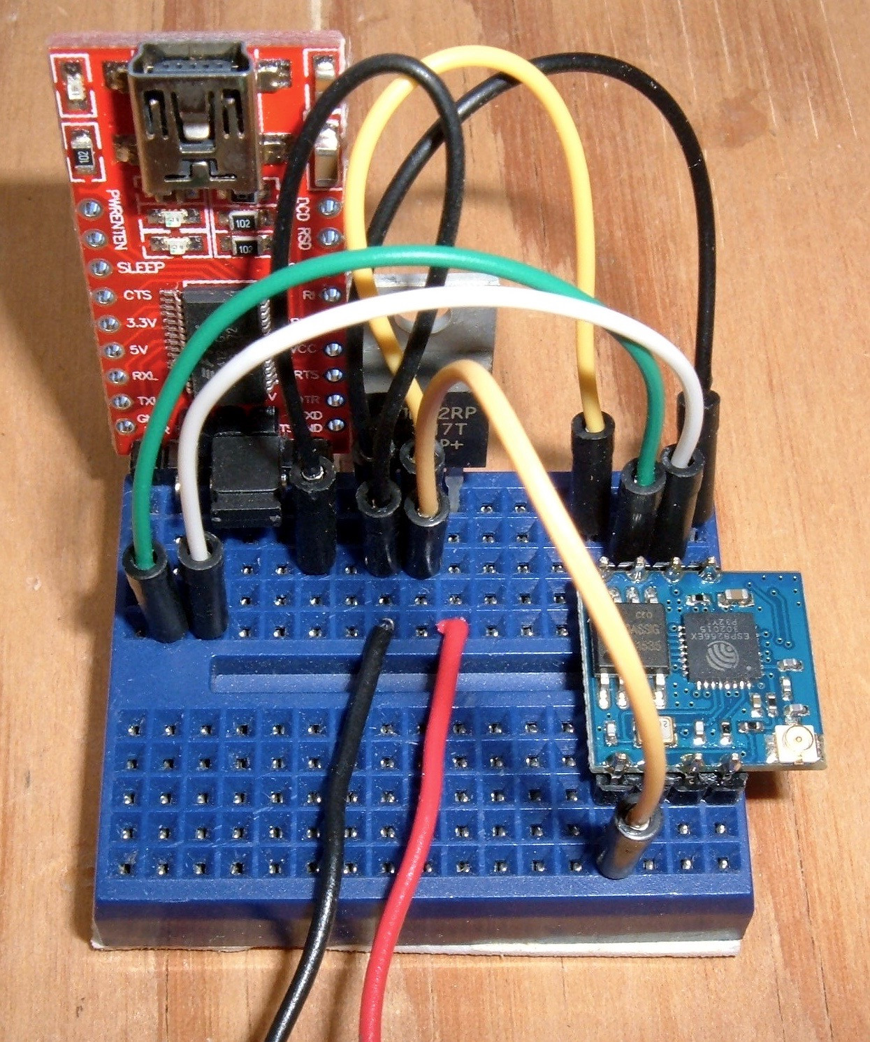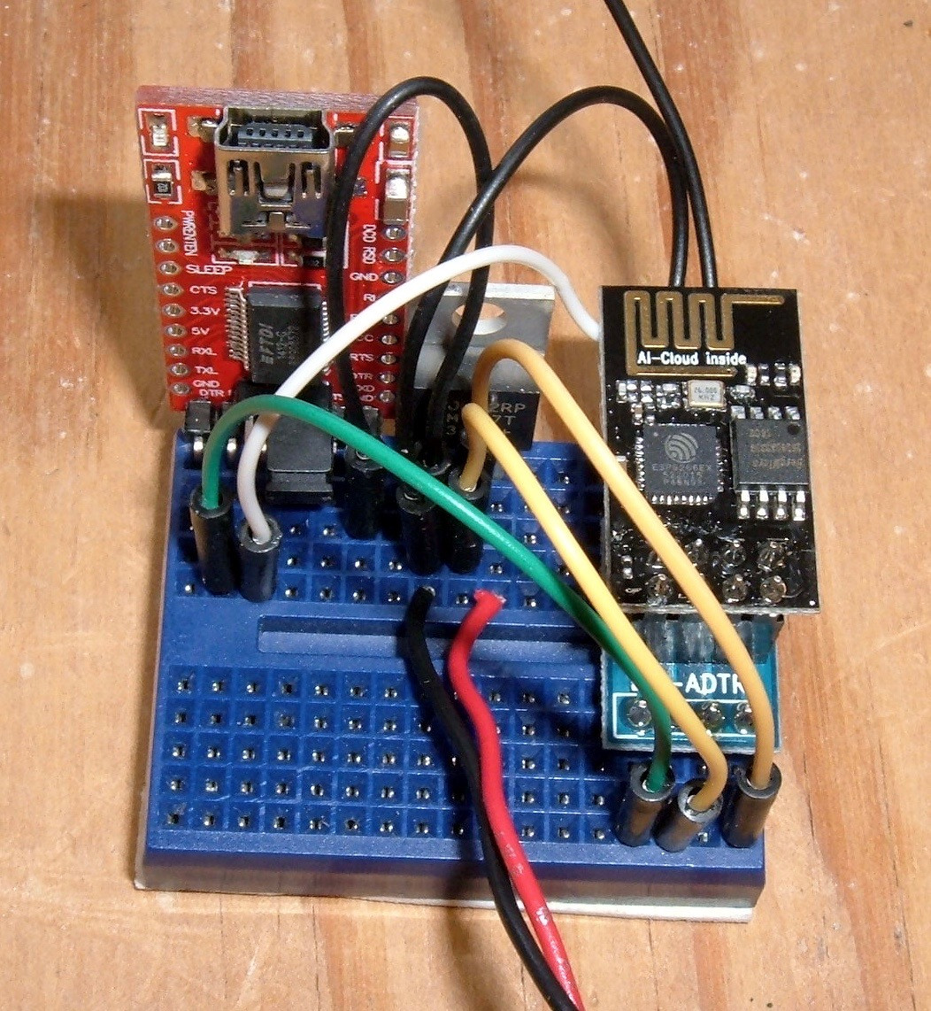 The next step is the power wiring. The FTDI adapter is powered over USB - so no need to power it (however, it won’t power the whole setup). The red wire from my USB plug is a +5V wire. This goes into the “P+” leg (the right most leg) of the voltage regulator. Coming out the middle of the regulator is the 3.3V regulated output. This needs to run into the VCC pin on your ESP02, as well as the CH_PD pin (if this is brought out - not all of them have it exposed, and if yours doesn’t have CH_PD, you don’t have to run that wire anywhere else). VCC is what powers the chip, and CH_PD is the chip enable. If it’s brought high (to 3.3V), the chip is powered on, and if it’s low (0V), the chip is powered off. However, it won’t float high on its own - you have to bring it high. That’s what the orange wire is for. Check your pinout!