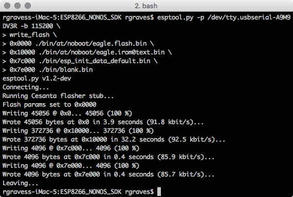 Reboot the ESP8266, and you should have an updated firmware! Check with “AT+GMR” - at the time of this post, AT version 1.3.0.0, SDK version 2.0.0.