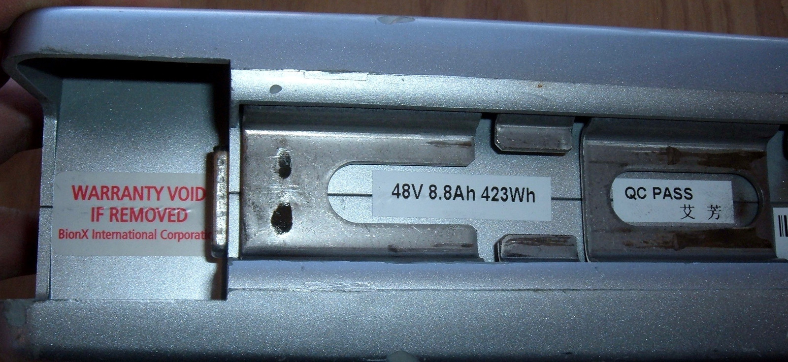 The outside of the pack has the usual assortment of labels and warnings.  I’ve got a fancy “Warranty Void if Removed” sticker (special printed for BionX International Corporation), a label with the pack specs (48V, 8.8Ah, and 423Wh), and what appears to be a bilingual QC PASS sticker.  Good to know.