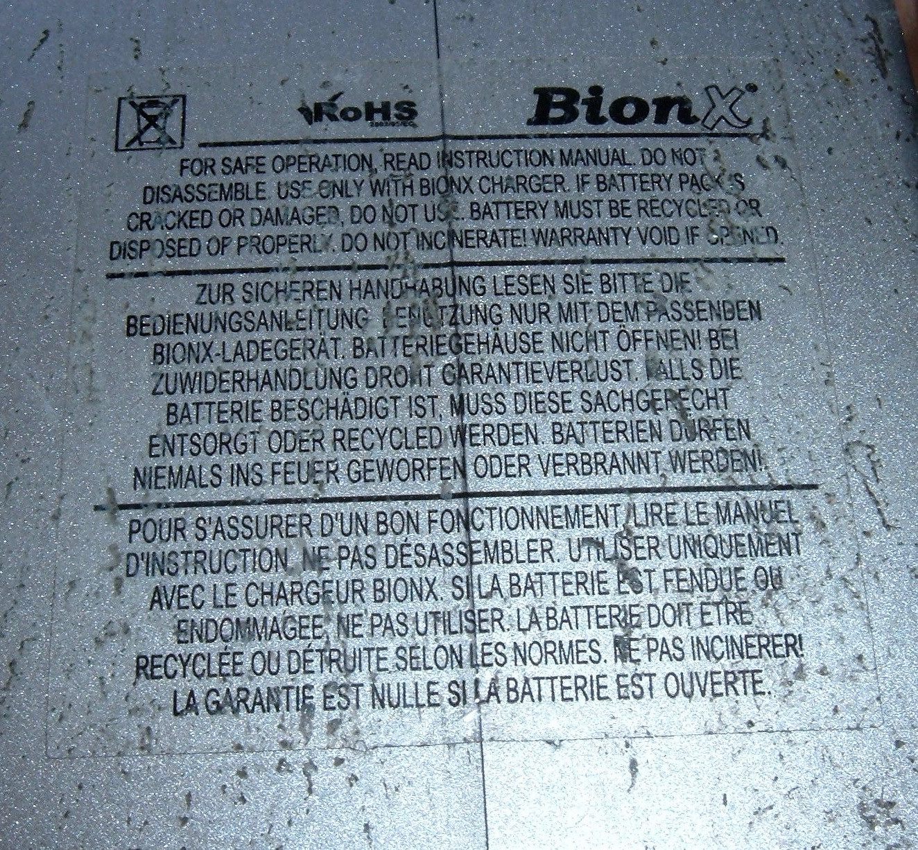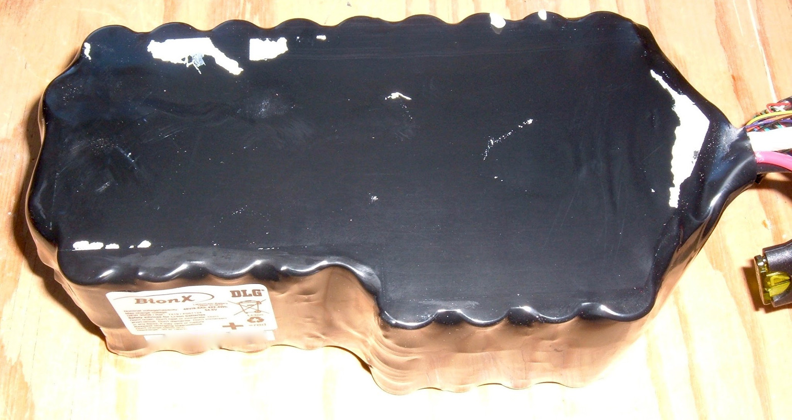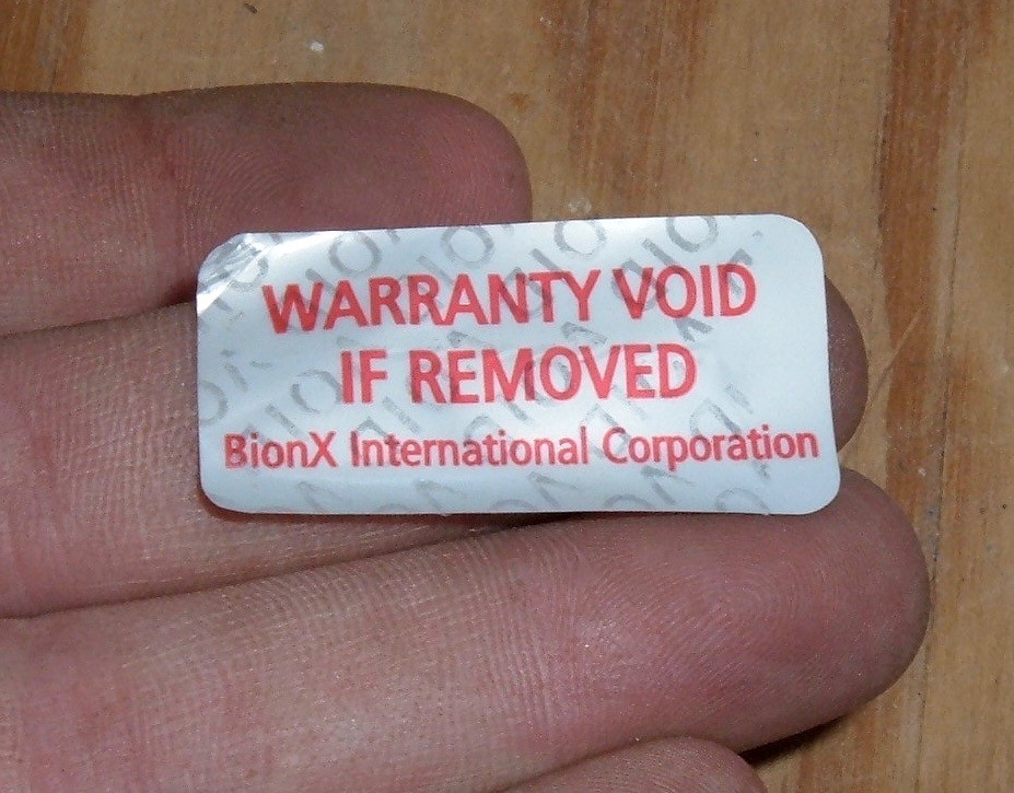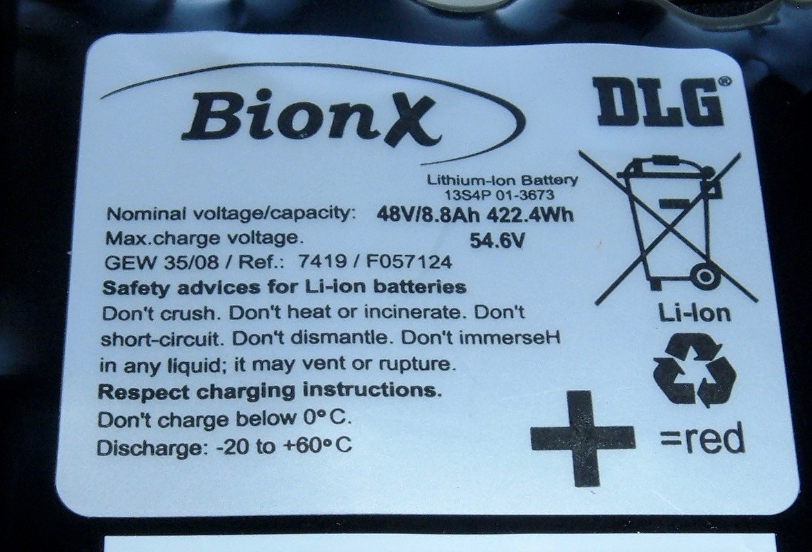 The label is, as usual, quite helpful.  This is an official BionX battery pack now, not the BMZ packs they used to use.  Well, or it’s a DLG pack.  I’ll figure it out in a bit.