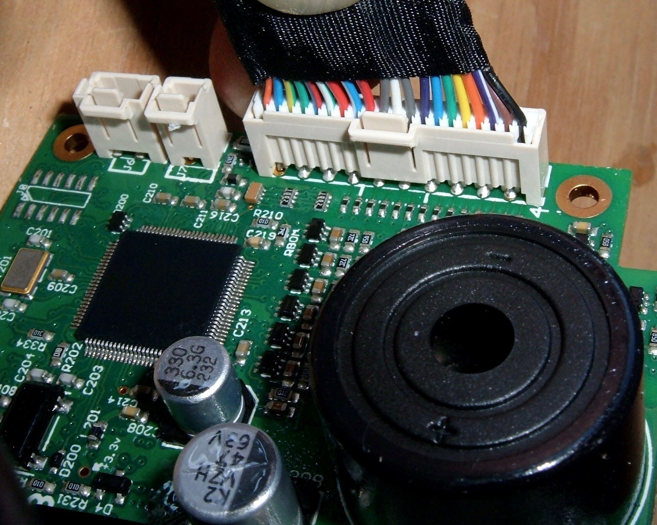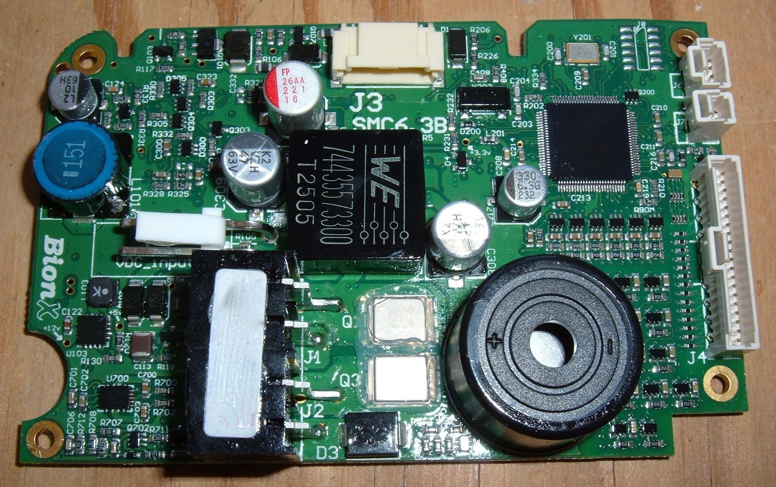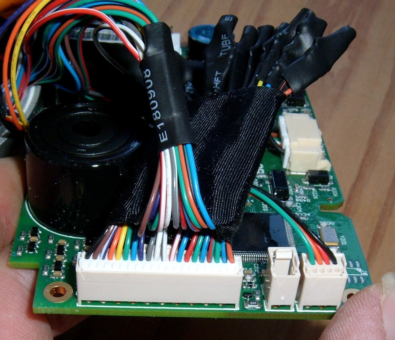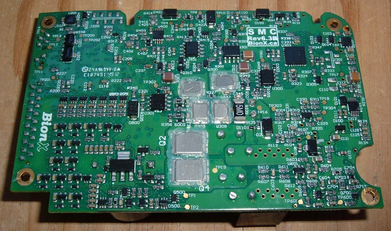 Of note, the whole board has a conformal coating - you can see the somewhat uneven surface in the flash glare at the bottom.  This is good - conformal coating a protective layer that keeps water and dust away from board components, and I’m glad BionX is doing this.  The very oldest packs I’ve worked with don’t have any sort of coating, but everything newer does.  This is better done than some of the boards, as the buzzer isn’t covered - I suspect this is why some BionX packs have a loud beep and others of the same generation have a very quiet beep.  In any case, I’m happy to see the coating.