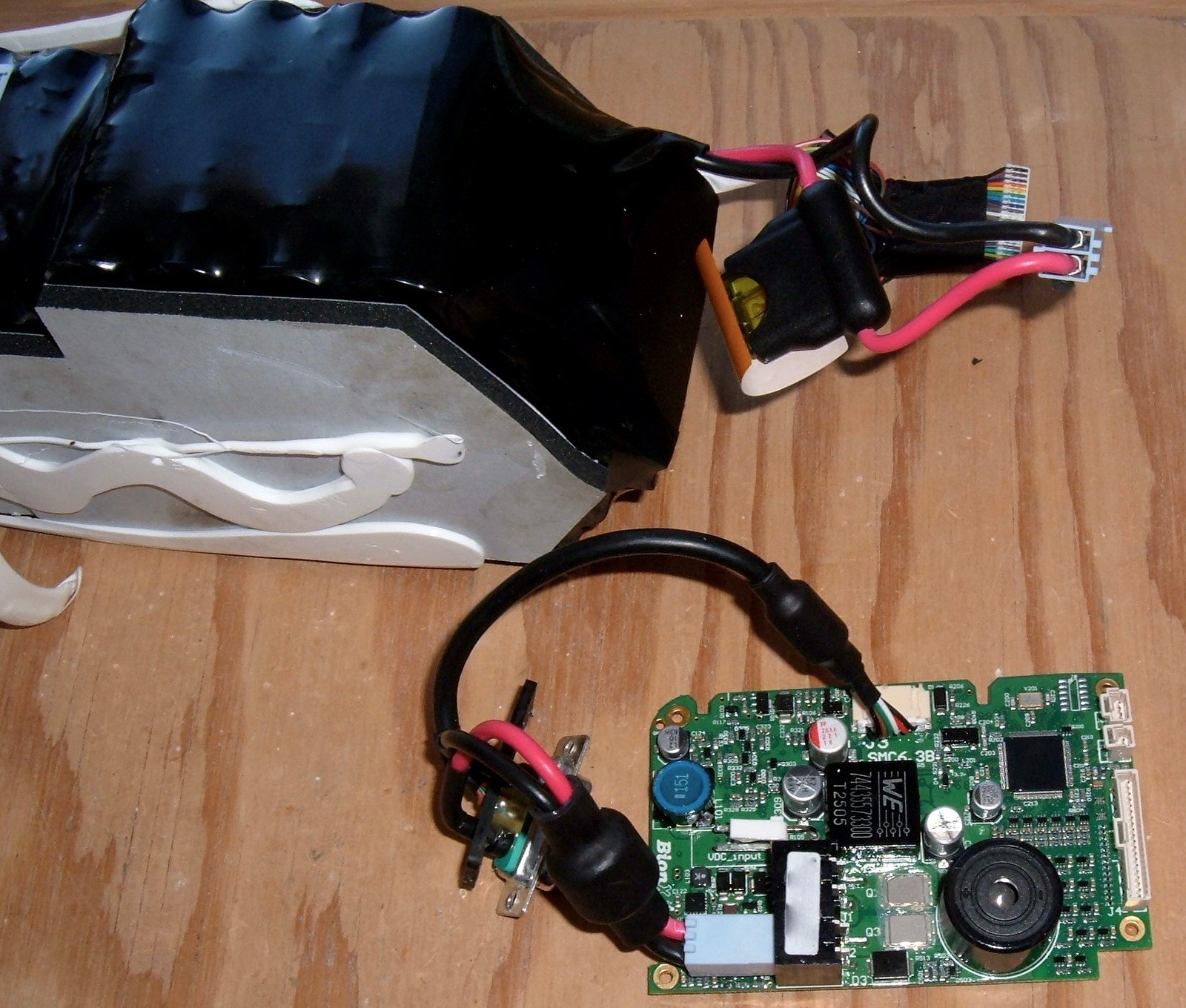 On the left side, the lowest connection is for the 7W2 output.  Above that, an identical connection goes to the battery pack.  The separate connection above the large black connector is the DC input jack, where the ~26V from the charger comes in and gets converted up (why not just use a 48V charger?  I have no idea, but I’d guess it relates to voltage limitations for exposed connectors or something).
