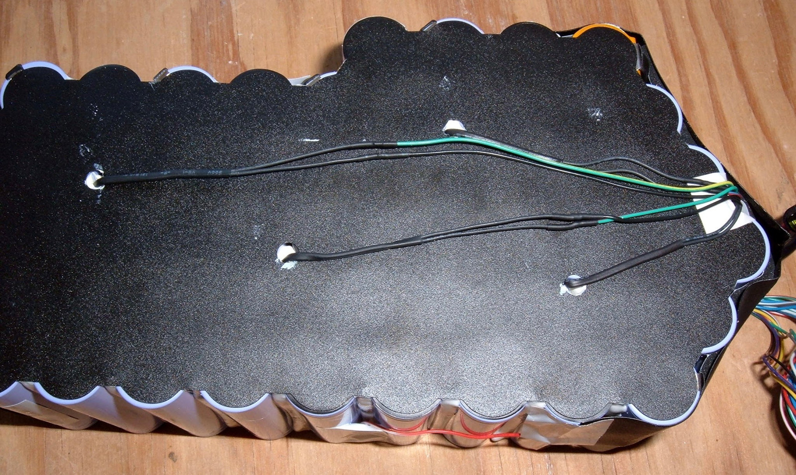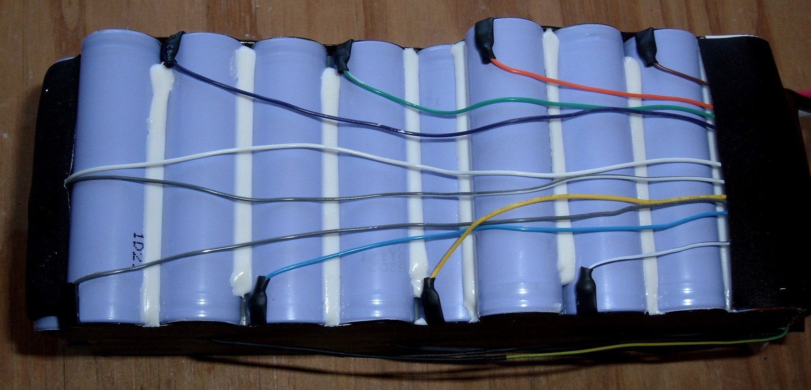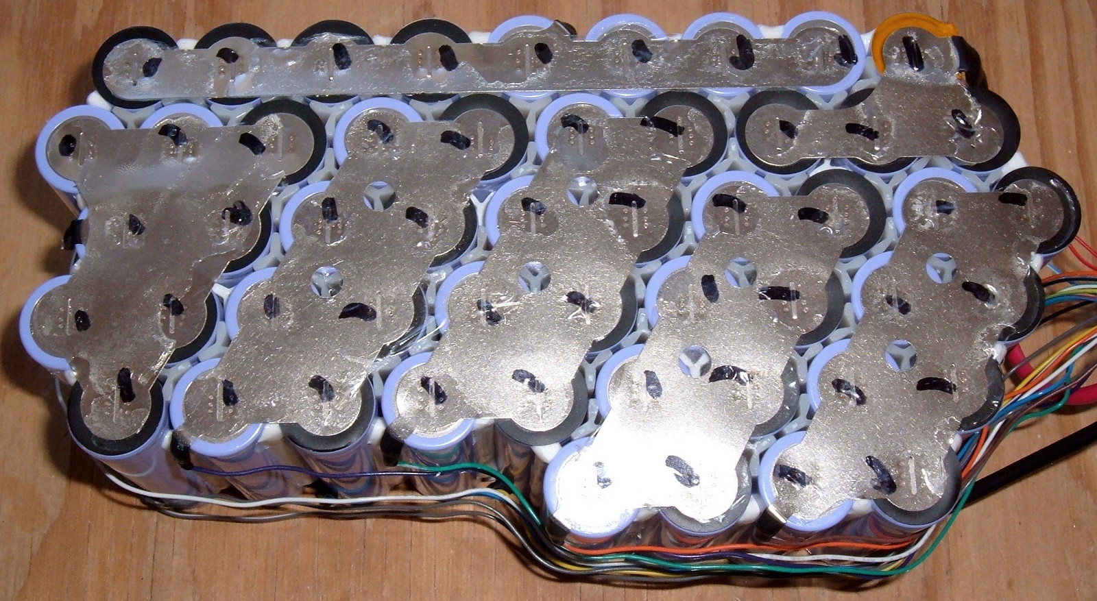 We must go deeper!  With the heat shrink removed from the battery, this is what one is left staring at.  A somewhat oddly shaped battery bank held together with plastic insulators on the top and what, to my slightly trained eye, appears to be multiple thermal probes in the pack!  On the bottom, one sees a rainbow of balance wires snaking around to the various points where they tie in.