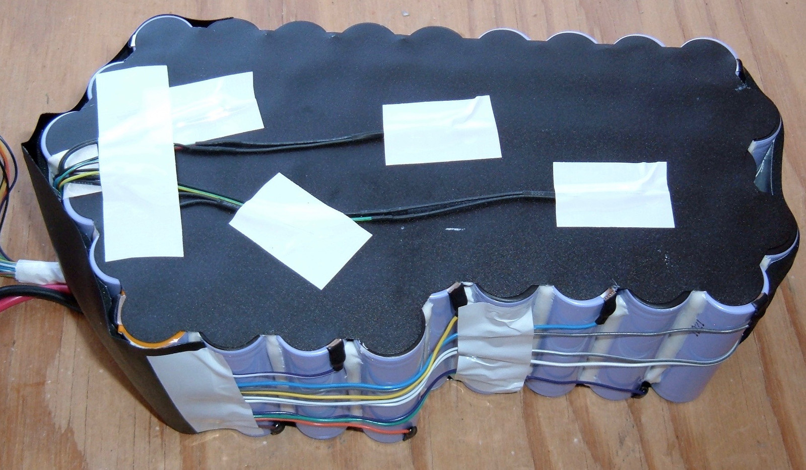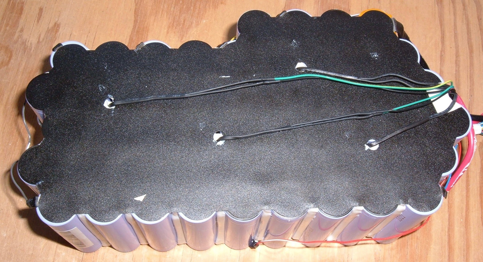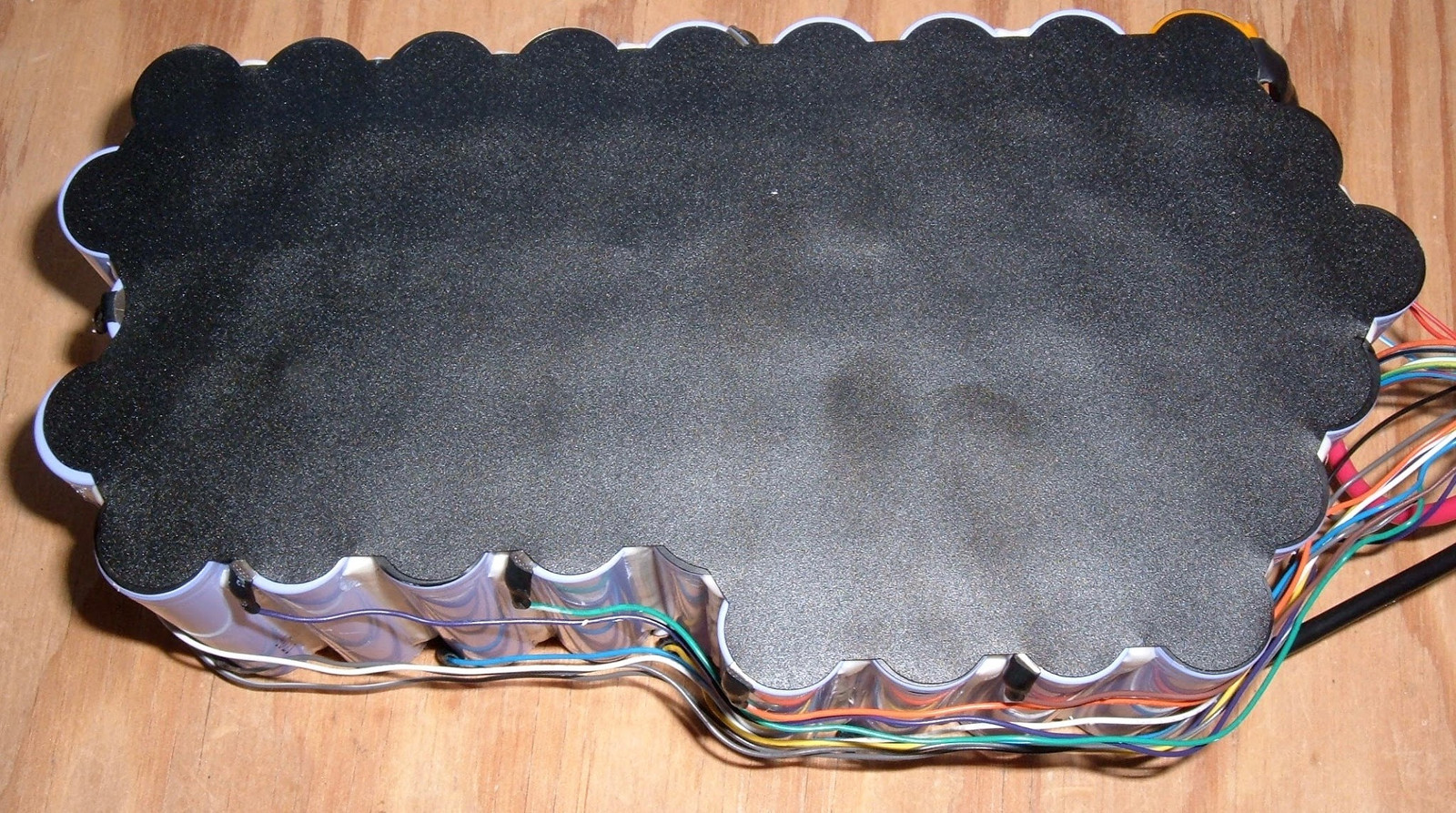 We must go deeper!  With the heat shrink removed from the battery, this is what one is left staring at.  A somewhat oddly shaped battery bank held together with plastic insulators on the top and what, to my slightly trained eye, appears to be multiple thermal probes in the pack!  On the bottom, one sees a rainbow of balance wires snaking around to the various points where they tie in.