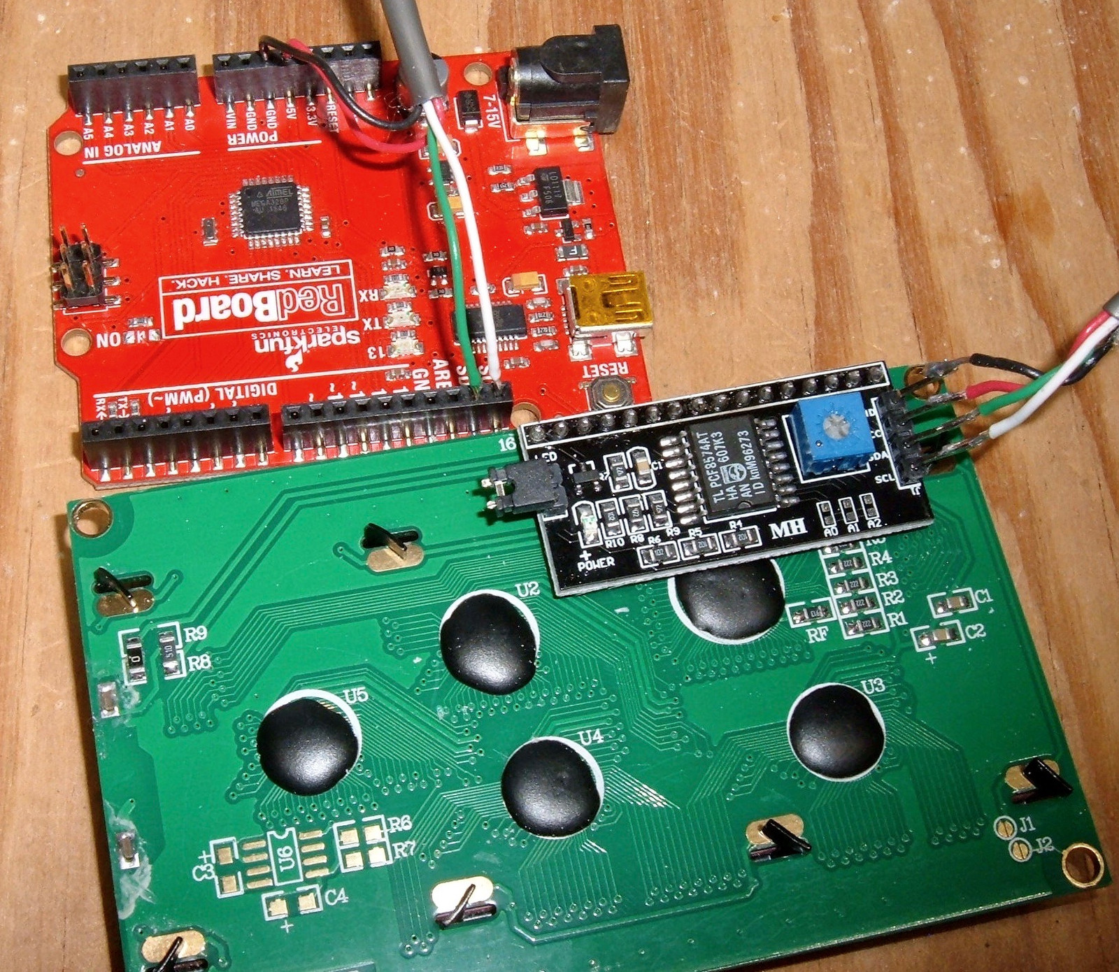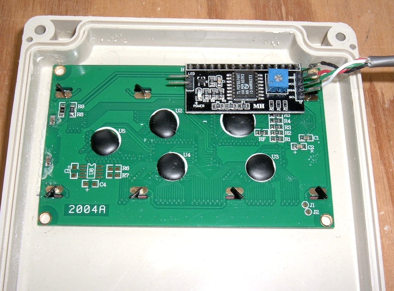 The backside shows the I2C interface (the black PCB on the top of the LCD board) and the interface to the Arduino - +5V, ground, SDA, SCL. Note that SDA and SCL are shared with A4/A5 pins, so don’t use those for something else.