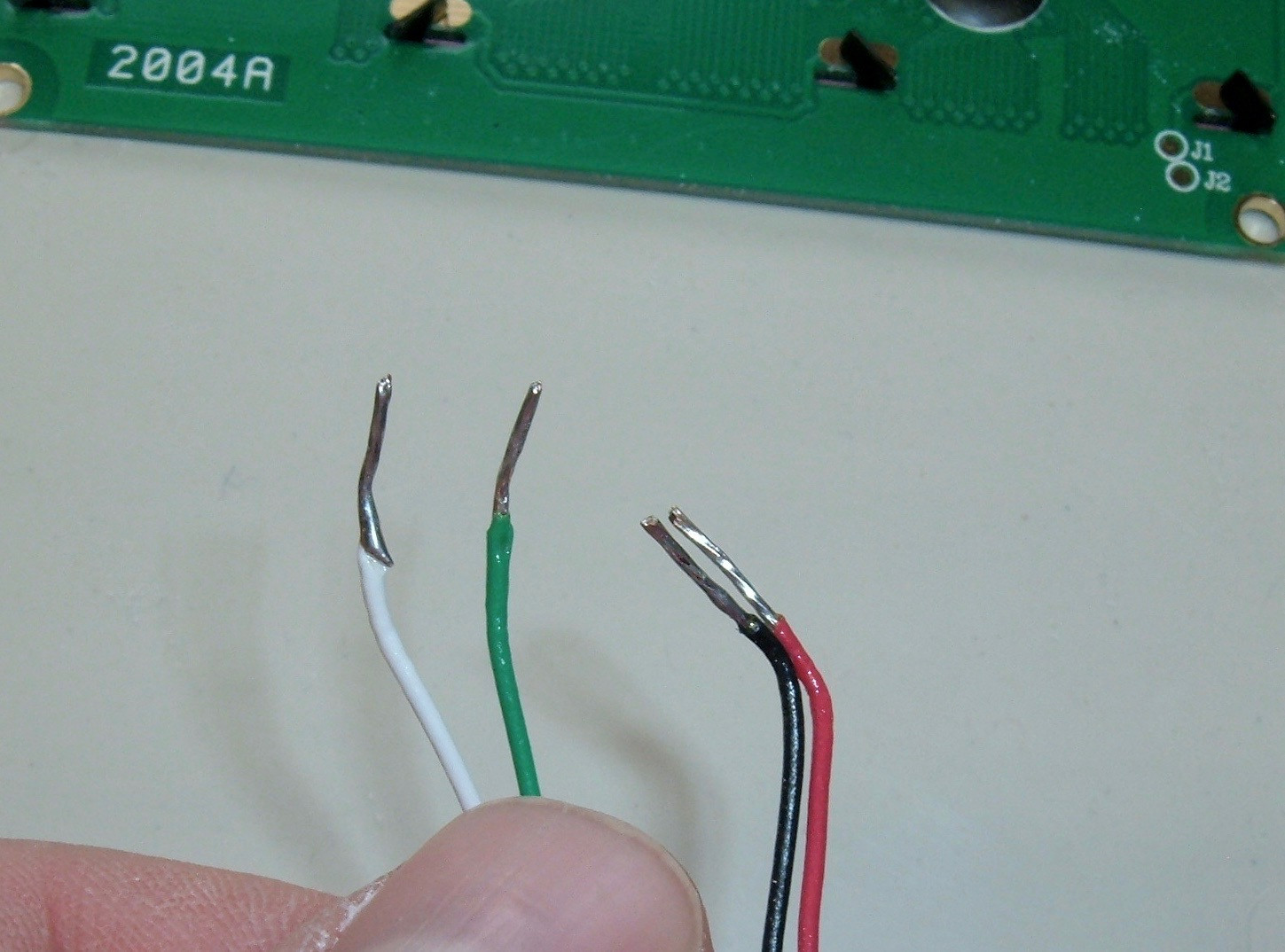 The cable I’m using here is some security system 4 conductor cable I found at Home Depot - I use this for many of my projects. You can make a perfectly good plug in lead out of the end of a stranded wire with some solder. These ended up a bit thick - it works better if you have the wire slightly starved for solder (the red and black wires are better). But, they plug right in to the Arduino sockets!