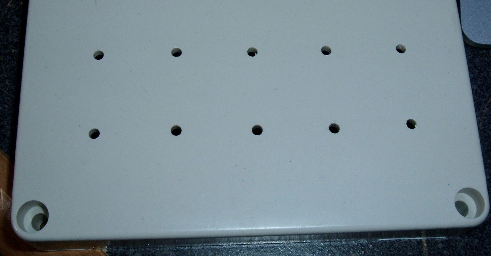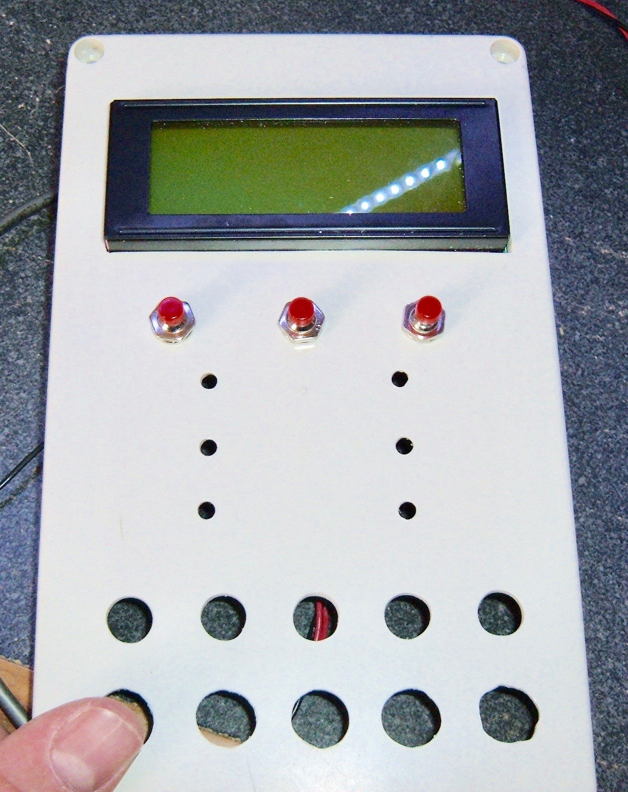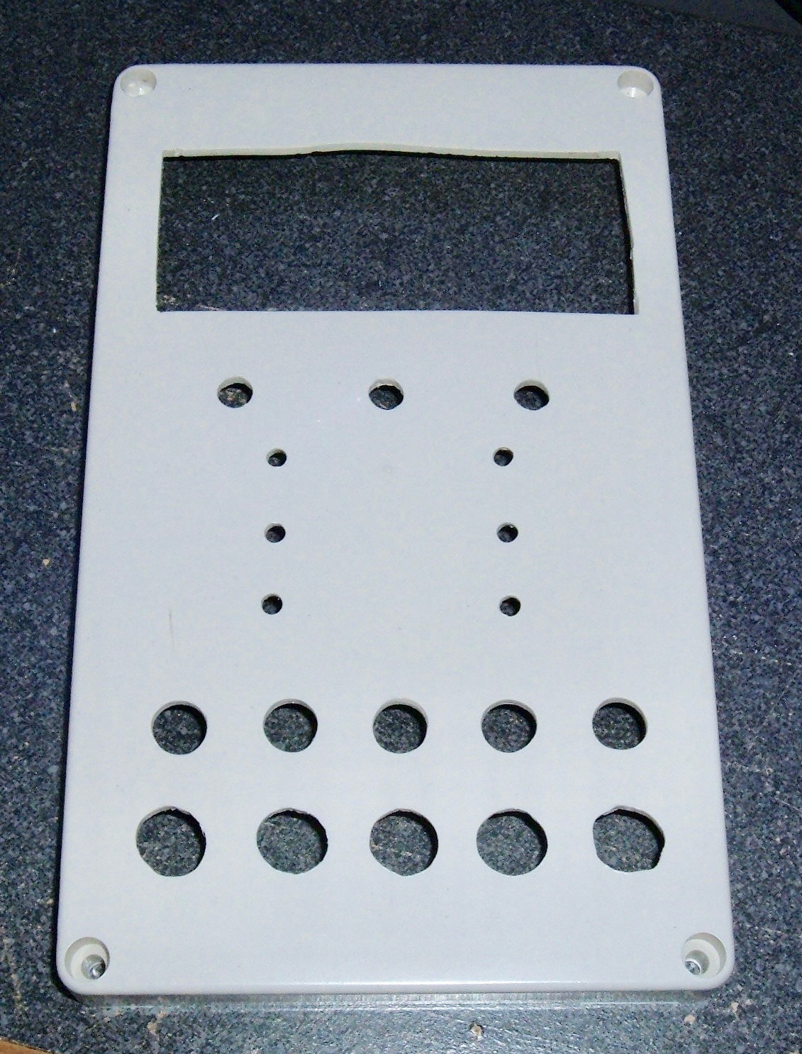 With the LCD installed and the no-drill zone around it figured out, I set about working out the details of LED and button holes.