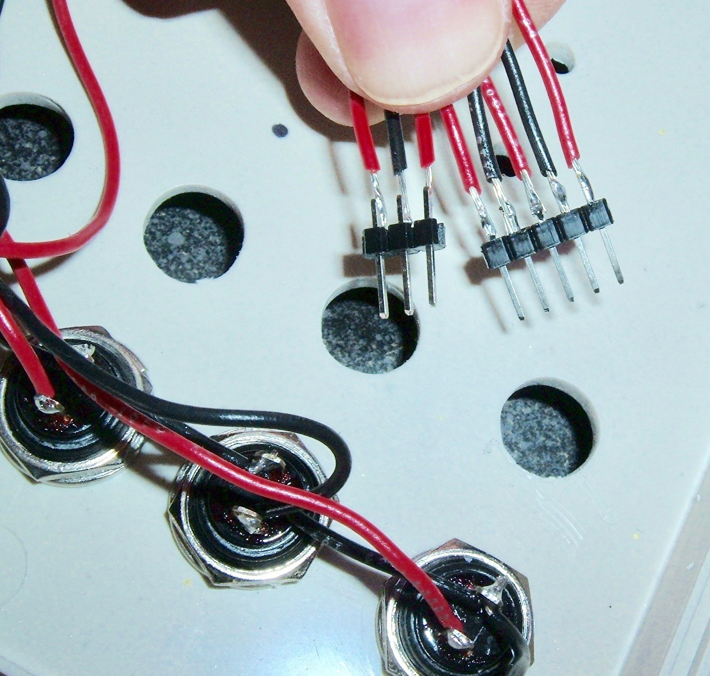 Power and ground wires from the strips are joined together in 0.1” pin headers, just like everything else.