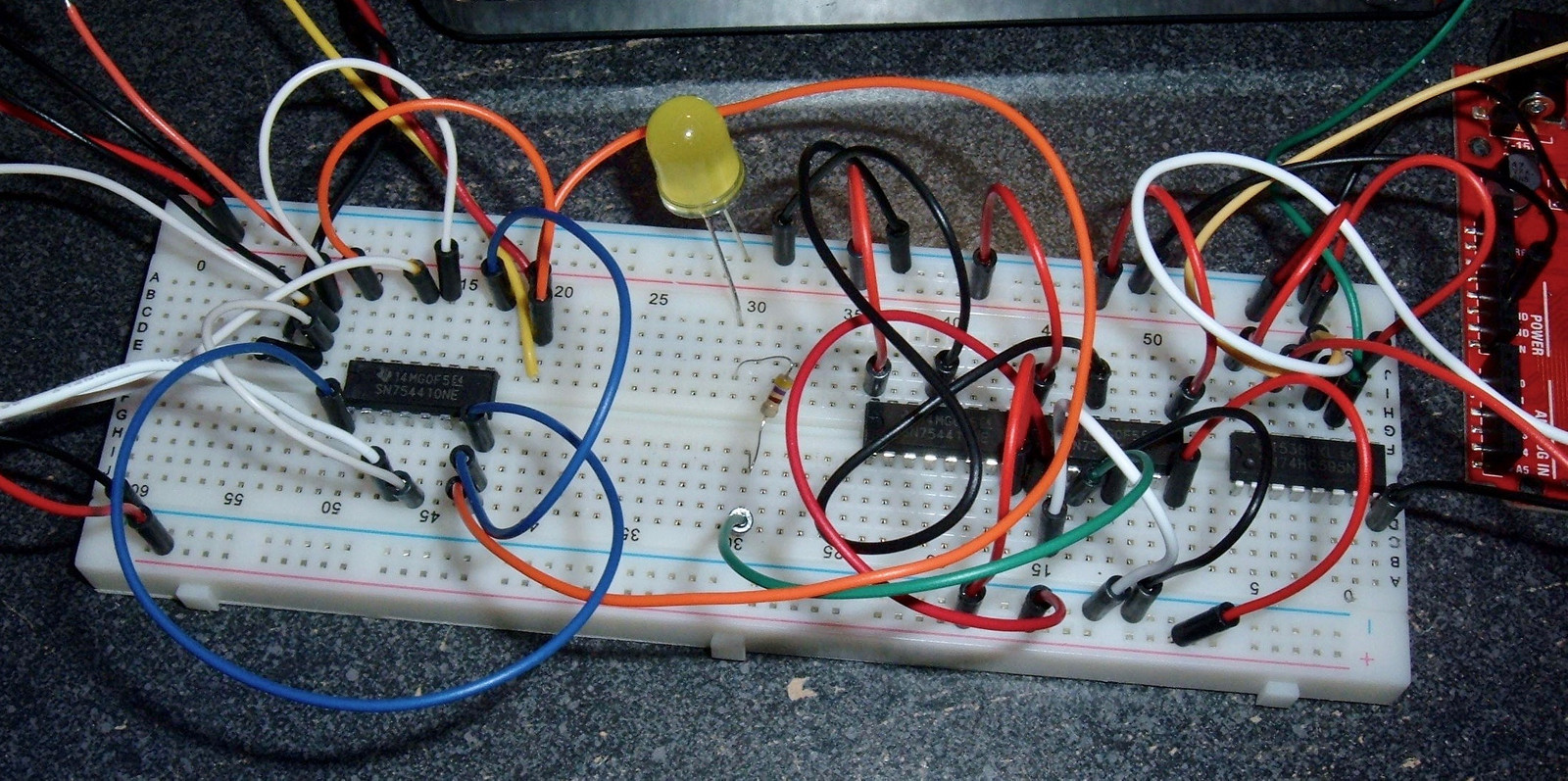 Instead of using one pin per LED, I decided to drive the LEDs through a SN74HC595 shift register. This lets me control up to 8 LEDs with 3 or 4 pins (I’m using 4 for now, which isn’t a huge gain over the 5 it would take me, but I can control more if I want, or other devices as well - think beepers). A shift register is a neat device that lets you push data in one end, and it ratchets through the device, eventually coming out the other end (if you care). It’s great to control a bunch of things on fairly few pins since they chain. With the same pin count, I could just as easily control 16 or 24 LEDs by chaining the shift registers together.