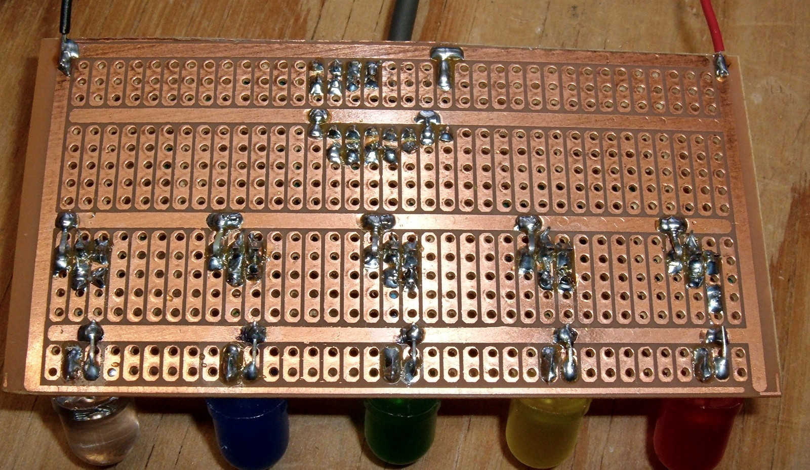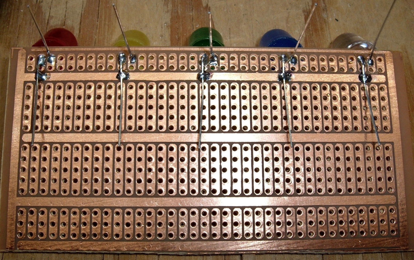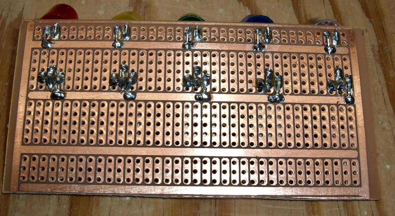 A nice perk about boards like this is that you have the fingers running back and forth, which are designed to be used as a power and ground bus. For this setup, I’m switching on the ground side, so the LED anodes are soldered straight to the positive bus (I declare that one positive, because I’m building it, and I can do that type of thing), and trimmed shortly after the solder joint.