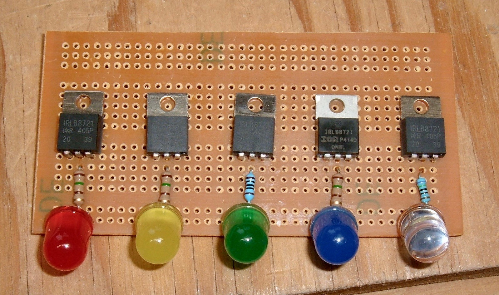 Flipping the board over, I’ve got the MOSFETs - IRLB8721s. The cathode (negative terminal) of the LEDs is connected to the resistors, which go into the center pin of the MOSFETs. The right pin goes to ground. And the left pin is the control input.