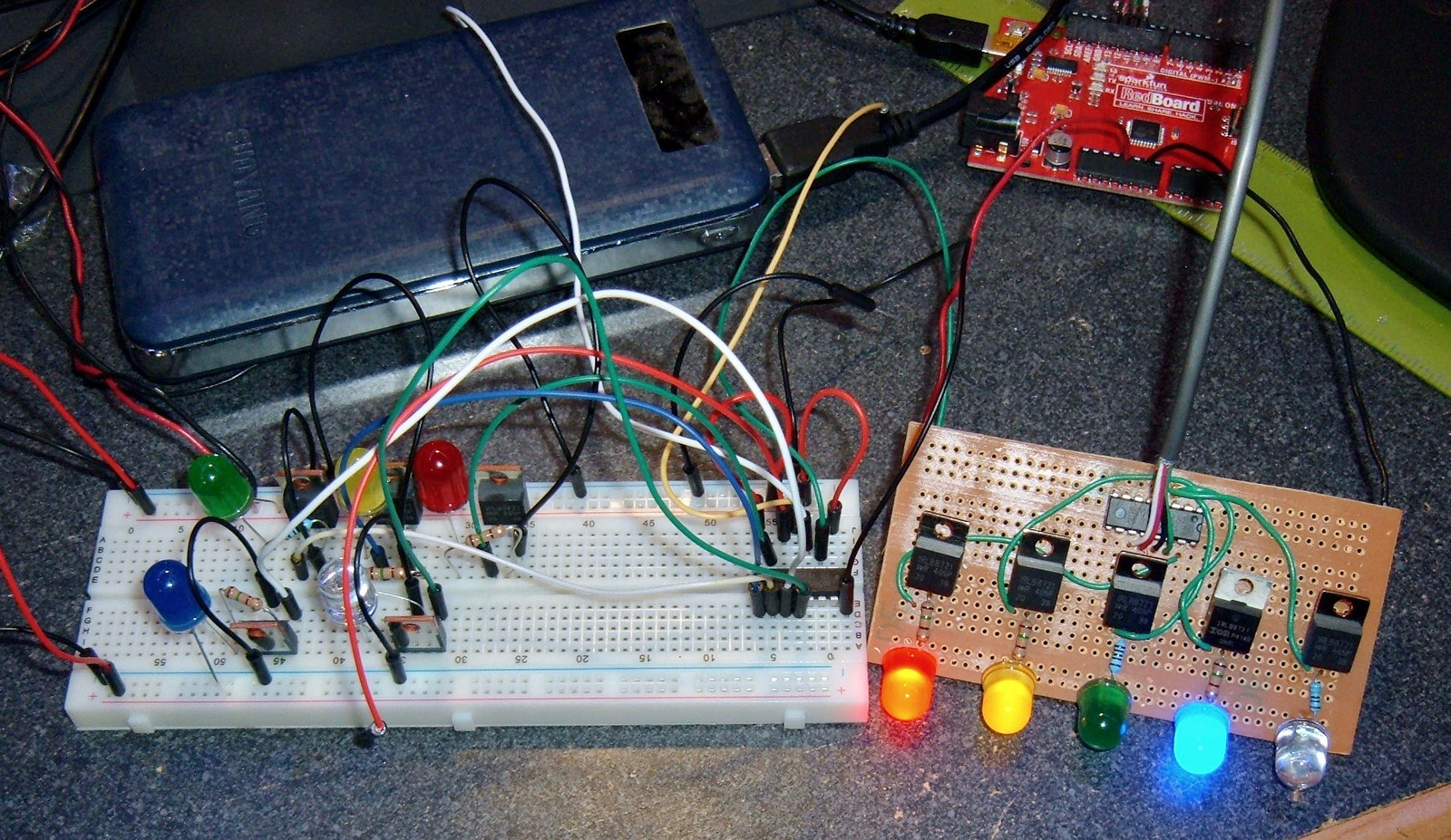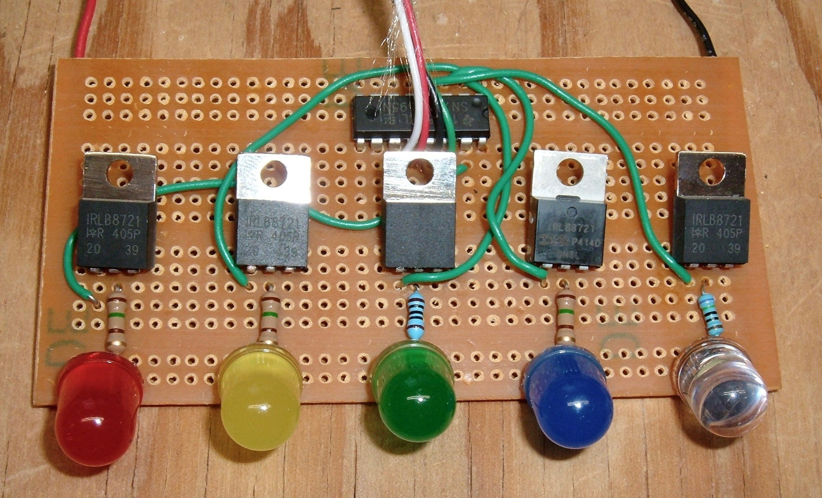 The shift register is up at the top and wired with a spaghetti of wires to drive the MOSFETs. I’m using one of my four conductor security system wires to carry the signals from the Arduino, and green signal wires, because green is… for signals. Or something.