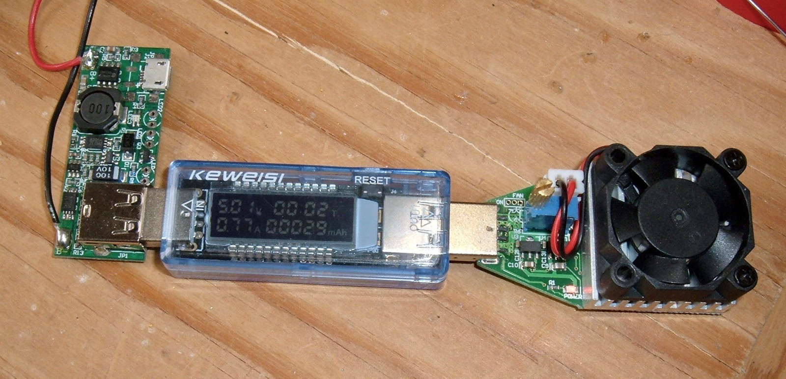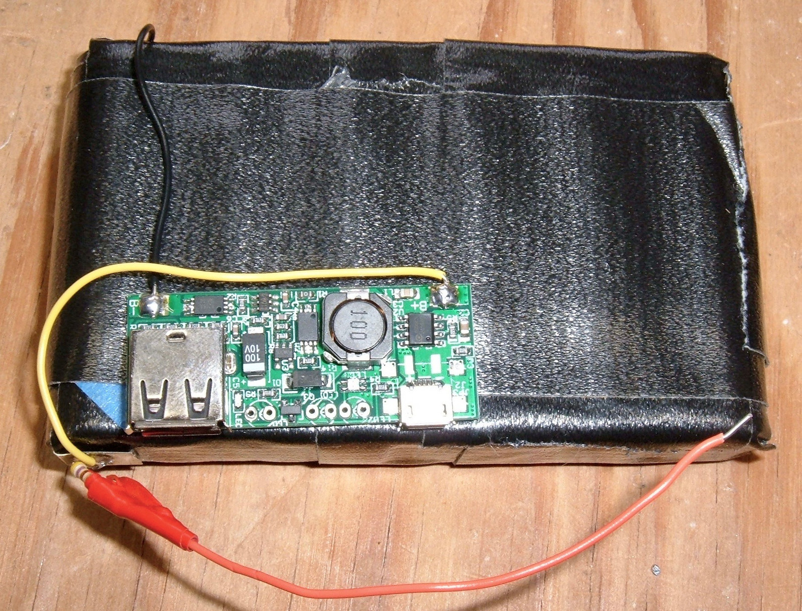 My tested-and-good power supply is attached to the battery. The USB A port provides power to the rest of the system at 5V, and the micro USB port on the right is for charging.