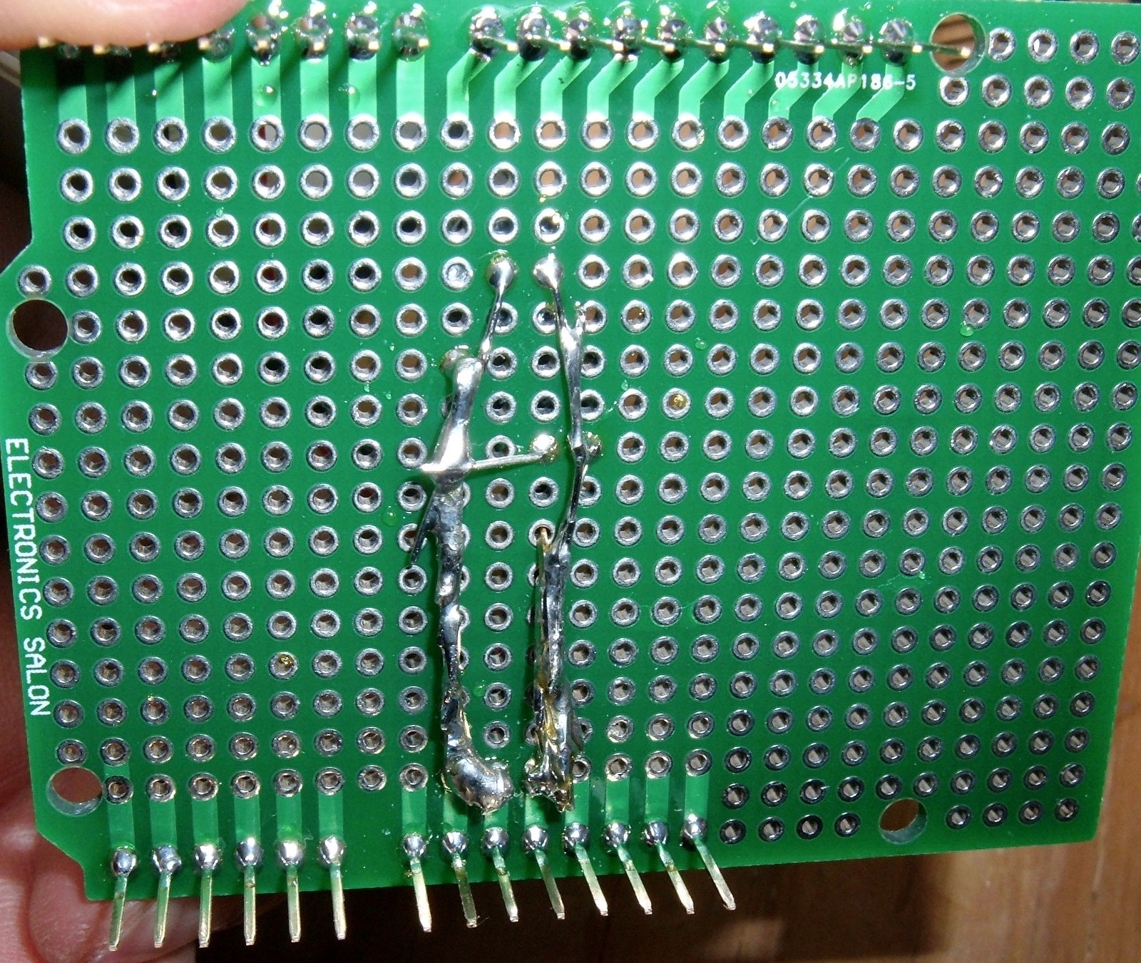 The solder glob at the bottom left corner ties the two ground pins together - the Arduino has two ground pins over there, and I may as well tie them together on my shield.