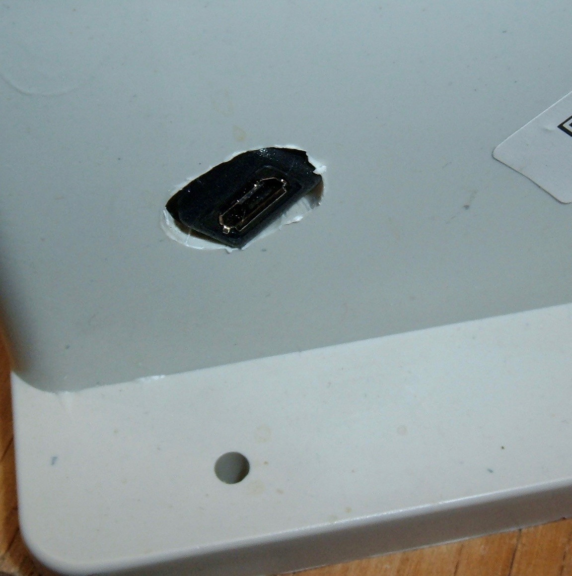The charge connector is a micro USB extension cable that’s run through a hole in the bottom of the box and then hot glued into place. I was planning for it to be level, but… anyway. It’s there.