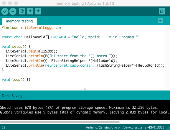 What’s one to do about this? Well, one can do many things, but what I chose to do is to write my own serial logging library - that uses zero SRAM except when actually writing messages to the serial port!