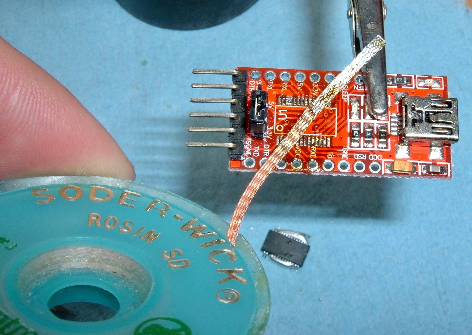 The next part is fun! You alternate your iron between the two globs until you have enough heat in both that they’re both liquid at the same time, then you tap the chip and it slides right off the pins!