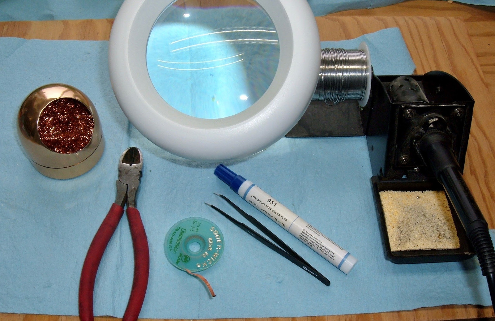 And otherwise, just regular soldering equipment. A flux pen (Kester 951), some tweezers, desoldering braid, a wire cutter for removing the used braid, and a tip cleaner.
