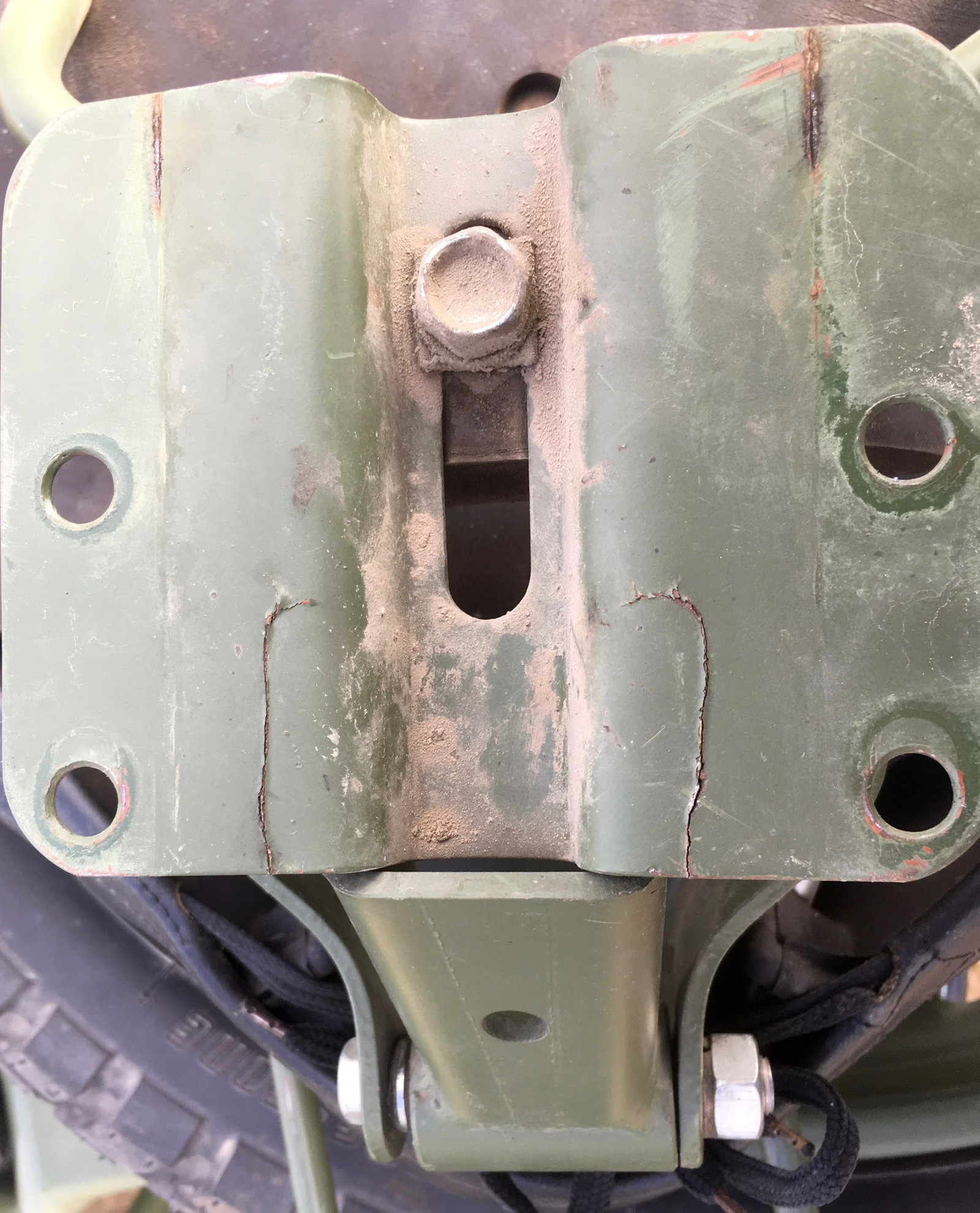 I tried to get some pictures of the crack from on top, but the crack is right along the weld and is basically invisible unless you’ve already found it. Here’s what things looked like from the underside. This is, unfortunately, a reasonably common failure.