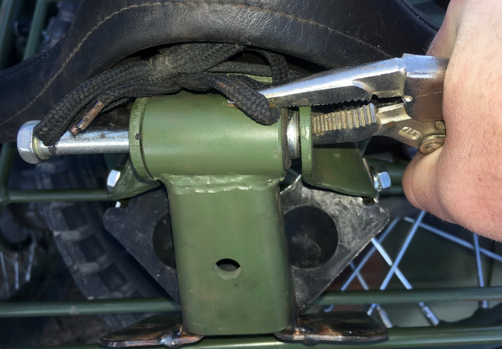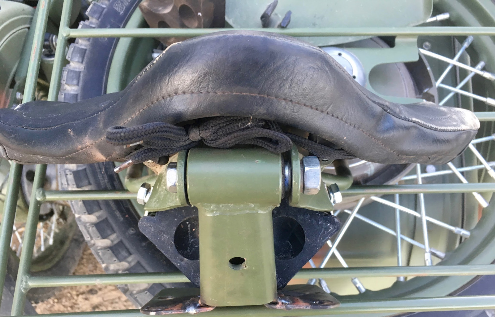 The “tractor seat” on a Ural is supported at the front by a metal strut, and at the rear by a big hunk of triangular rubber. This works unexpectedly well for such an archaic looking system, but mine was starting to get far too soft and bouncy. Worse, it was wobbling side to side a bit, and noticeably down in the rear.