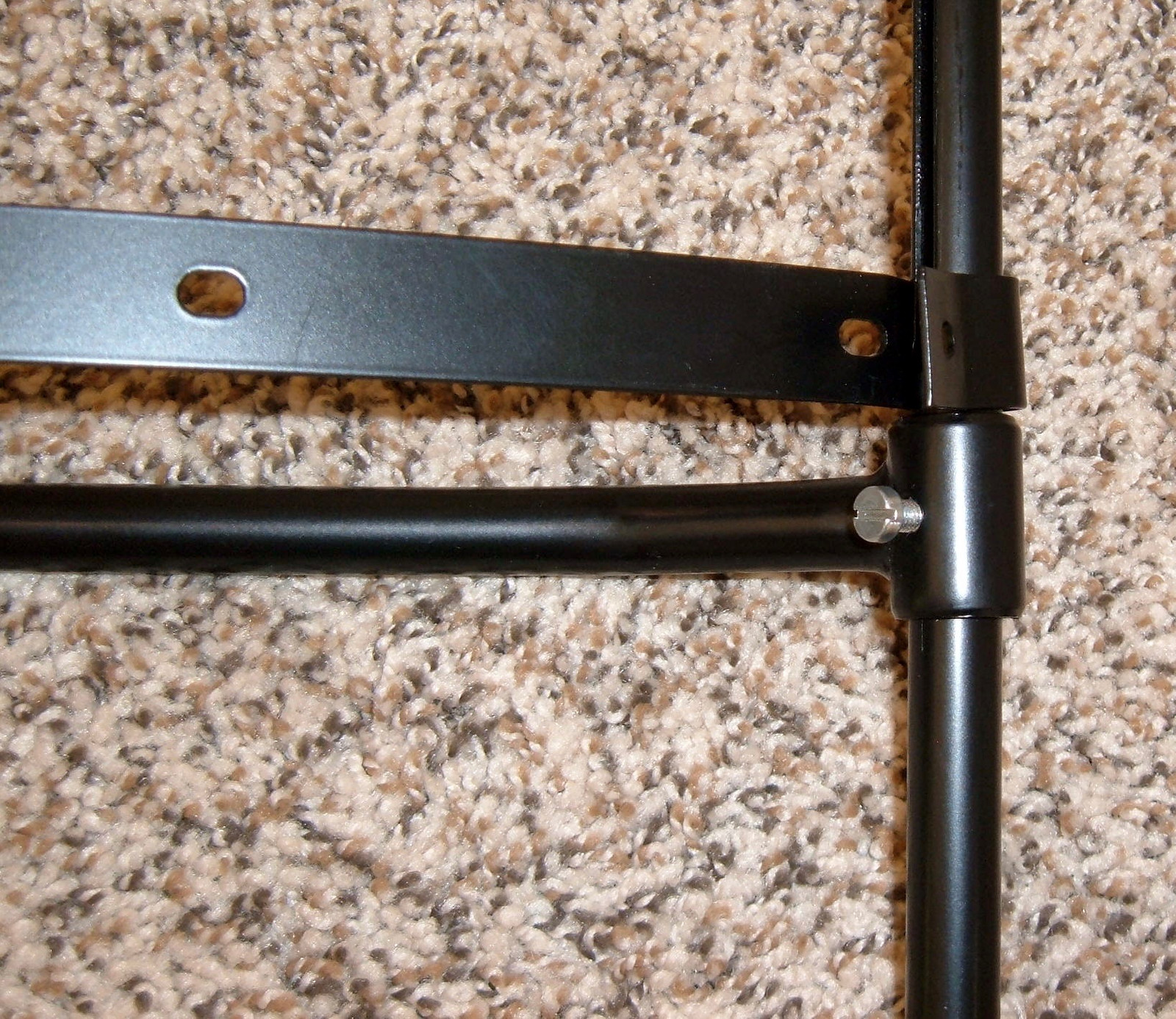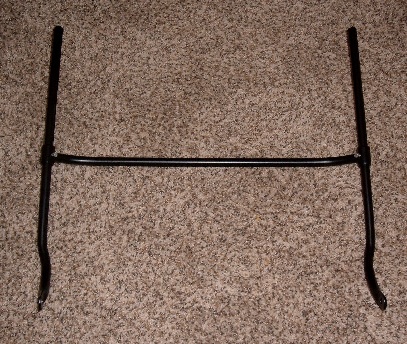 The first step is to get the major frame members assembled. The hand grip curves down towards the floor in this photo, and the bottom mount ends are curving up - this is looking at the frame from the front.