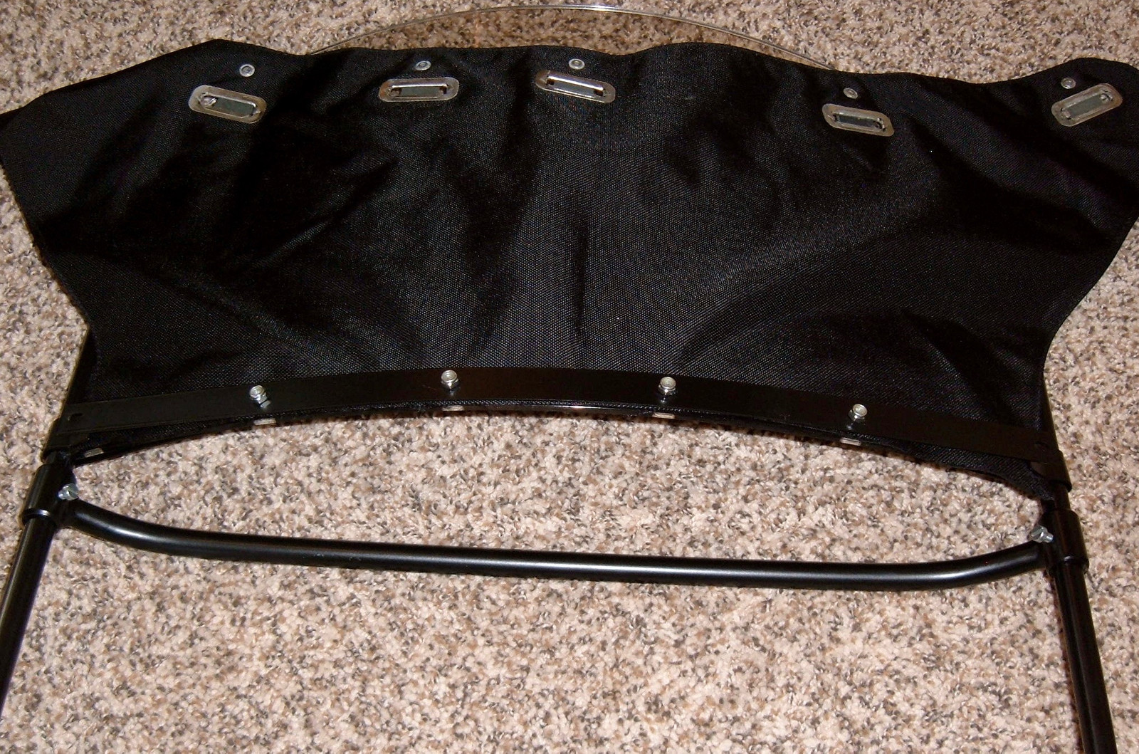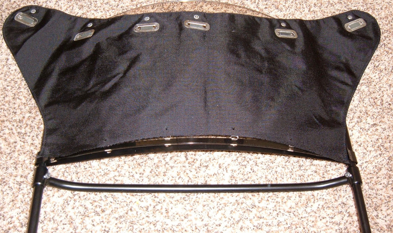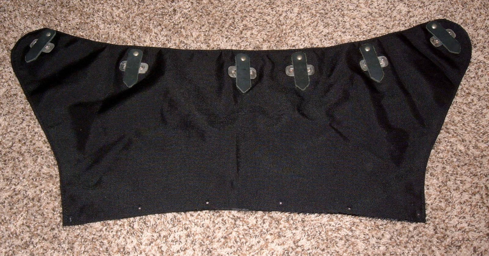 Next, lay the apron on top - it should have holes in the bottom that more or less line up with the holes in the plexiglass and mounting bar. Be sure the leather strips are facing the windshield - the apron folds down over the front mounting bar, so this is the correct orientation.