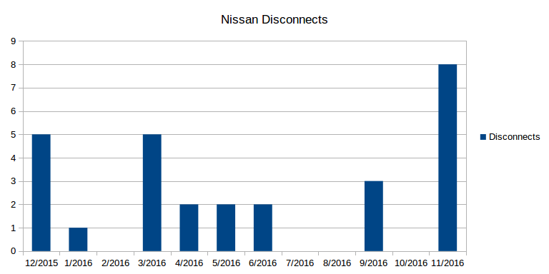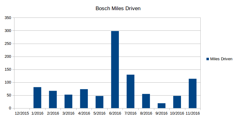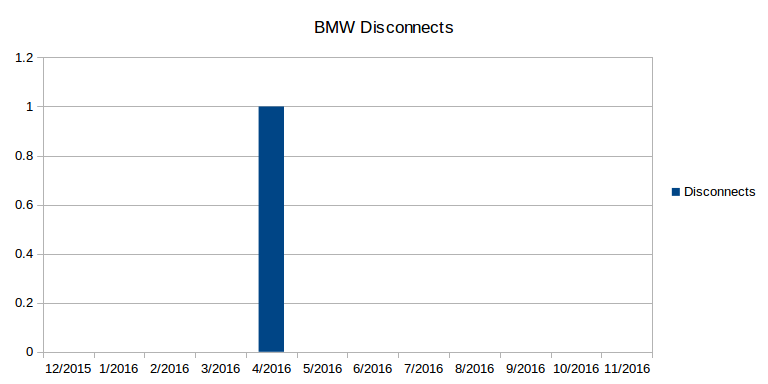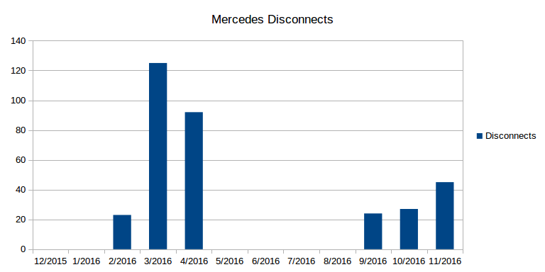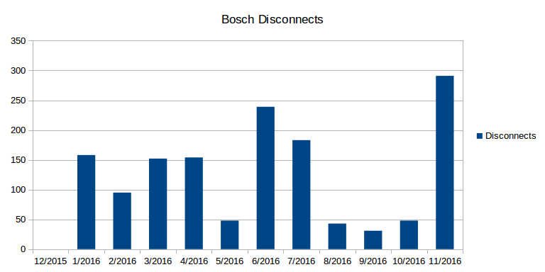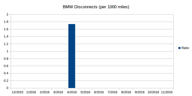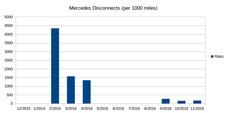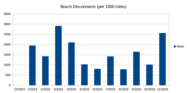 The main takeaway is that the Bosch systems can’t get much beyond a mile, in ideal conditions. It looks like there may be some weather sensitivity here as well - late winter conditions have a lot of disconnects per mile, and November had a big spike as well.