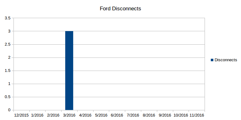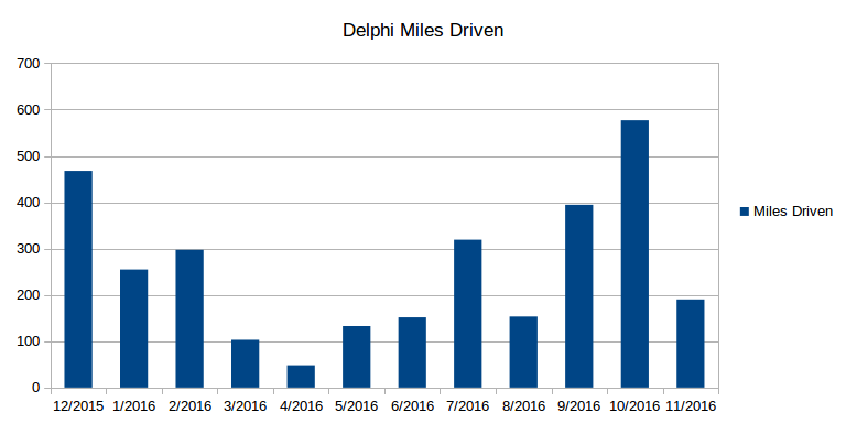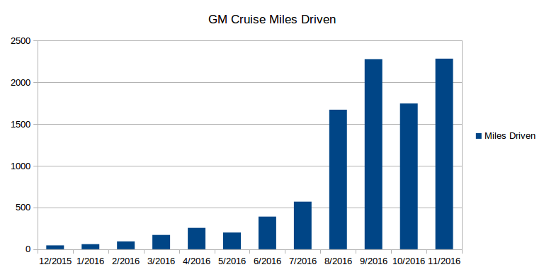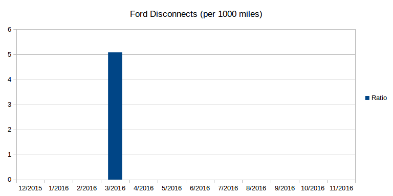 I assume Ford has a test fleet somewhere else and was working on California for some reason in March. They put on a good number of miles with a low disconnect rate of just above 5 per 1000 miles (so 200 miles per disconnect), but this is all they reported for California in 2016.