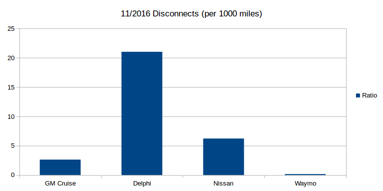 I’m limited in my analysis to what the reports state (so, California, for Dec 2015 through Nov 2016). Some are very detailed (Waymo’s), some are sparse (most of the others, though the Mercedes one pager takes the “brevity” award).