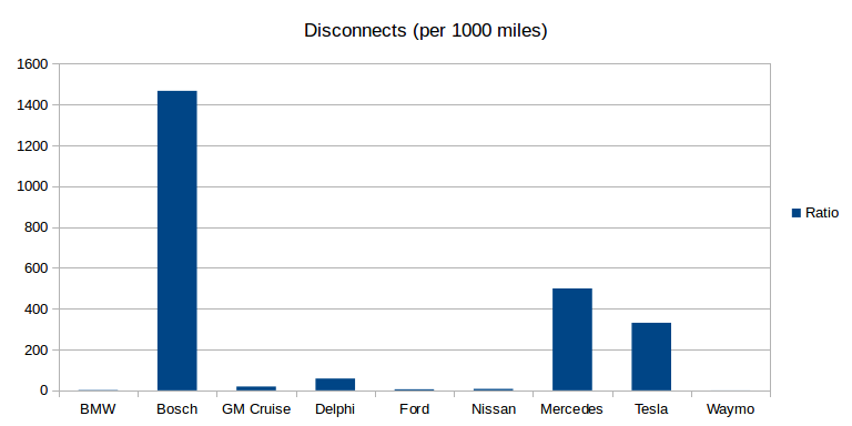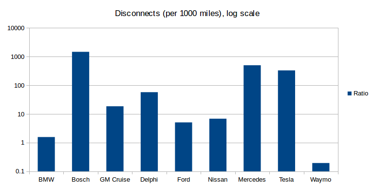 The year average of disconnects per mile average shows the variation in the different approaches to self driving (and, presumably, approaches to self driving testing). There are four orders of magnitude difference between Bosch and Waymo (1442 down to 0.18).