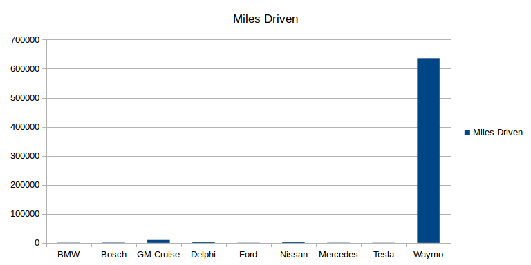 I’m only reporting data from companies that actually reported driving miles on public roads. Honda and Volkswagen both submitted reports, but don’t do any testing on public California roads.