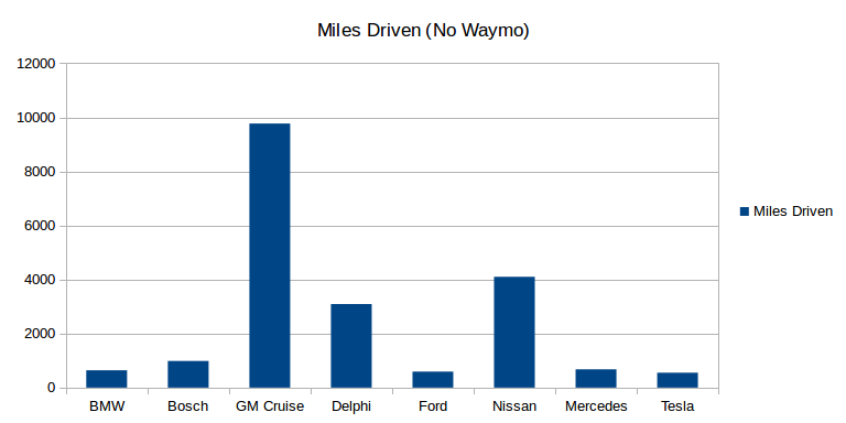 If one removes Waymo, the other companies come into a useful focus - and GM Cruise is leading everyone else by a factor of two and change. That, combined with the consistently improving performance over the year, says really good things about them.