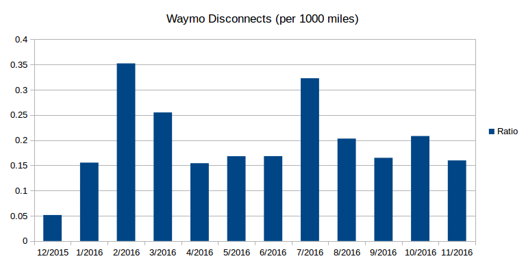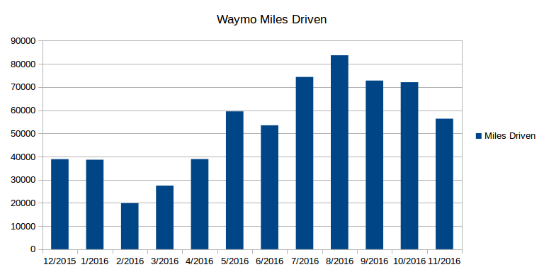 I have one graph for total miles driven each month, one graph for total disconnects each month, and one graph showing the disconnects per 1000 miles driven - which is the most interesting graph, as this shows how well the automation is handling the actual task of driving. This graph also gives a decent idea as to the improvement over the year.