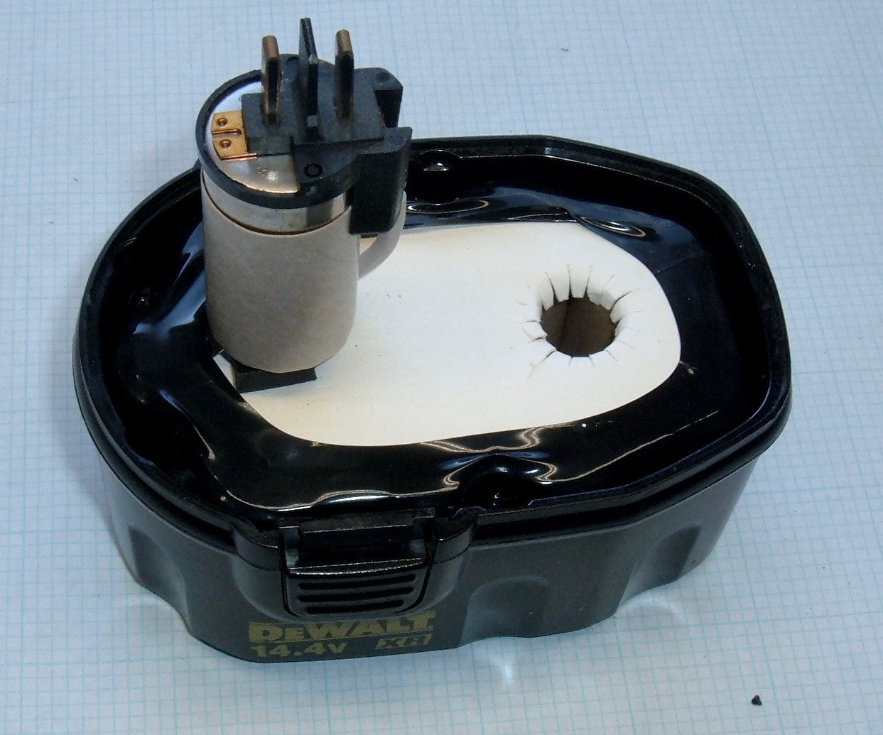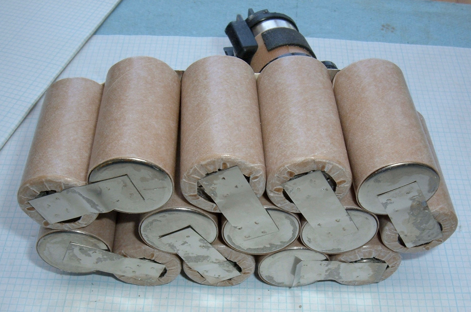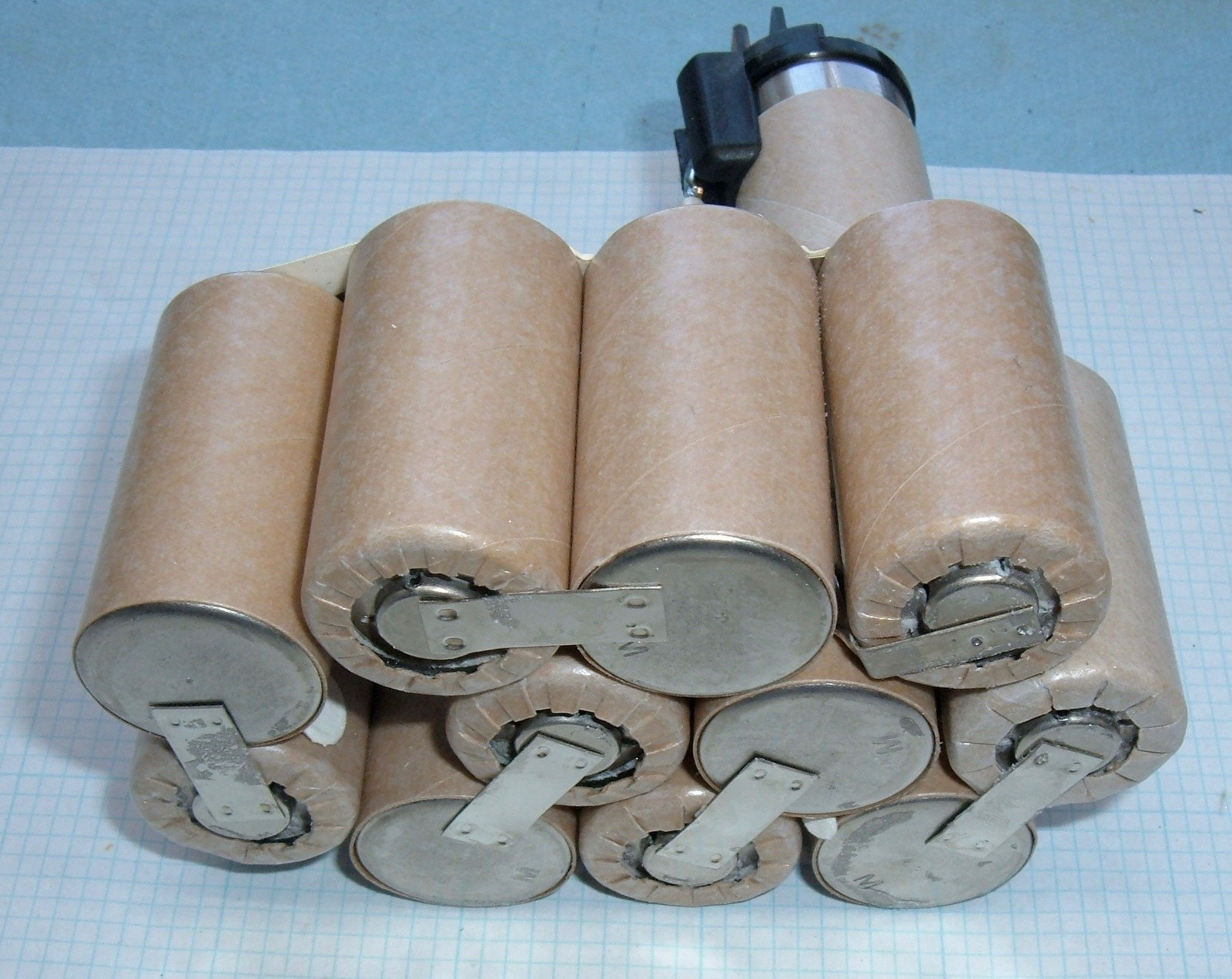 DeWalt NiCd tool batteries. Either 12S for 14.4V, or 15S for 18V. Otherwise, almost entirely identical, and entirely made of completely unlabeled cells. I have absolutely no idea what these cells are in terms of capacity, because they have no markings at all. Even with the cardboard insulation removed, there’s nothing.