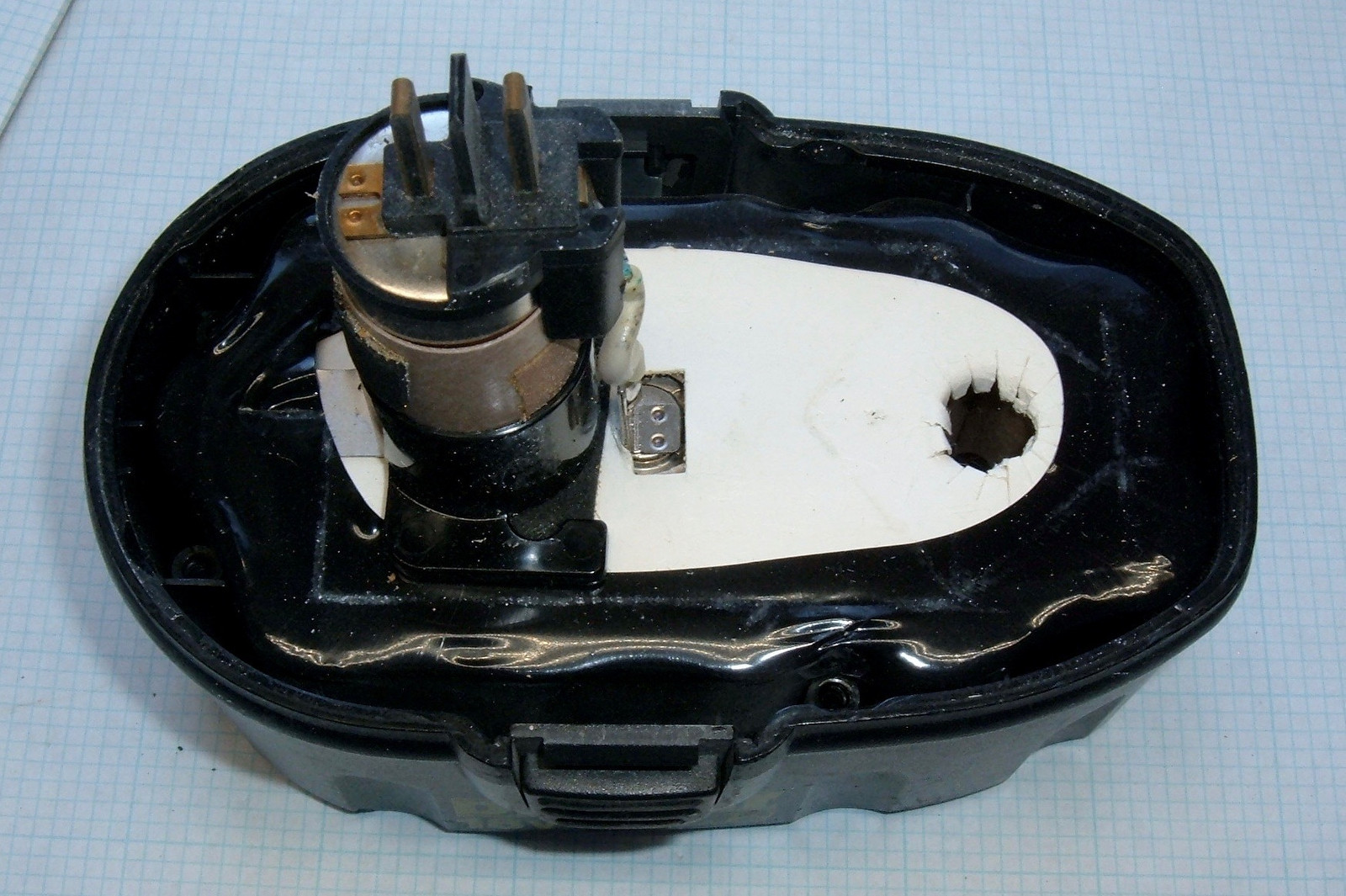 No security screws on this pack! Just normal Torx T10s. The top comes off to reveal the normal 18V arrangement, with one cell shoved up the stem, and a pair of contacts. Nothing extra. Not even a thermal sensor!