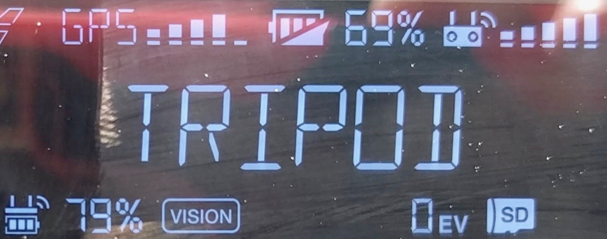 To enter Tripod Mode, you can either use the Intelligent Flight Modes icon on the left side of the screen (the blue thing in the screenshot below - I’ll also use “alien” to refer to it), or press on the 5D button (the stick to the right of the screen on the physical remote). You’re clicking the button into the controller, not moving it in a particular direction. Either way will get you to the Intelligent Flight Modes menu, from which you can pick Tripod Mode. You may have to tap “agree” on a NFZ warning the first time you do this (basically, that it won’t fly into a no fly zone, and you’re not going to be an idiot).