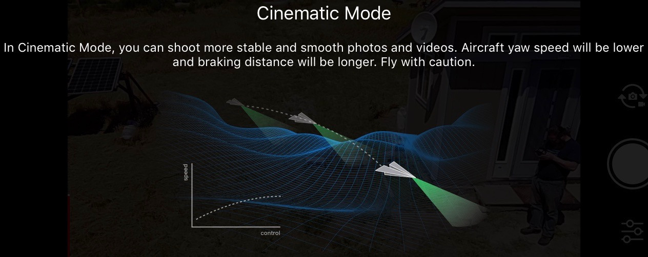 If you read last week’s post, you might recall that I talked about being smooth on the sticks and practicing gradual acceleration and deceleration. I also mentioned that there was a mode that would do this for you. Cinematic Mode is that mode - it’s synthetic smoothness with the sticks for the lazy.