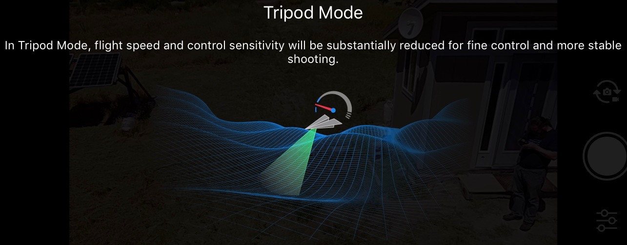 There are two ways to exit Tripod Mode (and most modes): Long press the pause button to the bottom left of the controller screen, or tap the red X along the left side of the phone. If your phone is acting up, the pause button might be a good bet. If that fails, consider holding the RTH button for a few seconds, or toggling Sport Mode (see below), but if this is the case, you’re having a bad day.