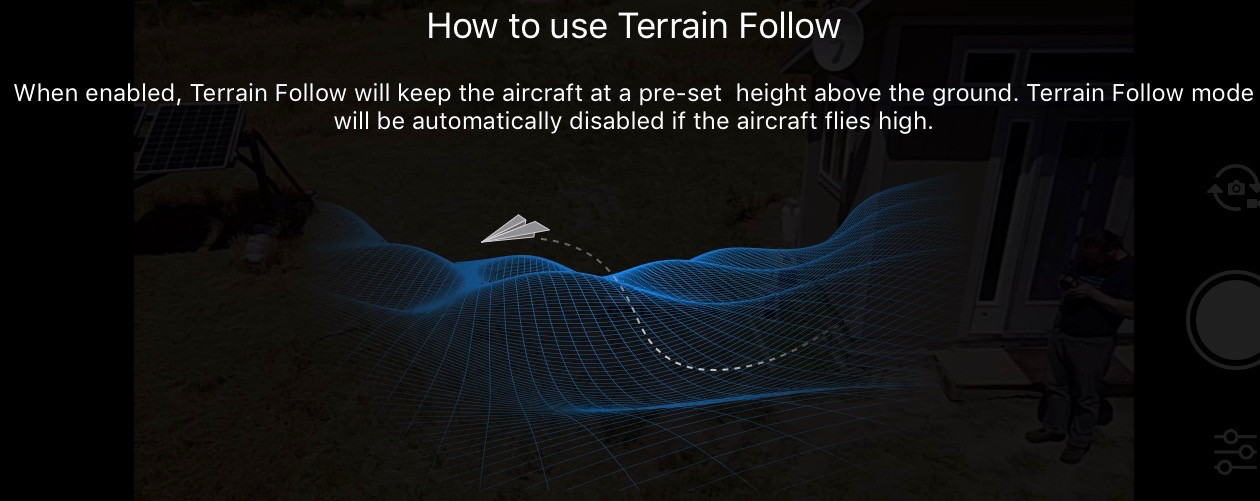 Much like the other modes, you also get a status bar indication that you’re in Terrain Follow mode, and the controller display will say “TERRAIN” as well.