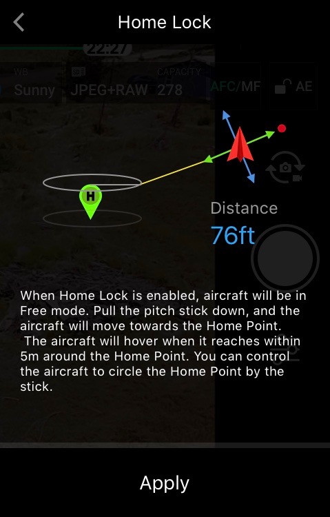 Once you click “Apply,” the Home Lock flight rules go into effect and the Mavic Pro flies as described above, with stick movements being all relative to the home point. If this pane is up, you’ll see the distance from the home point, which is rather redundant as the bottom of the screen also shows this.