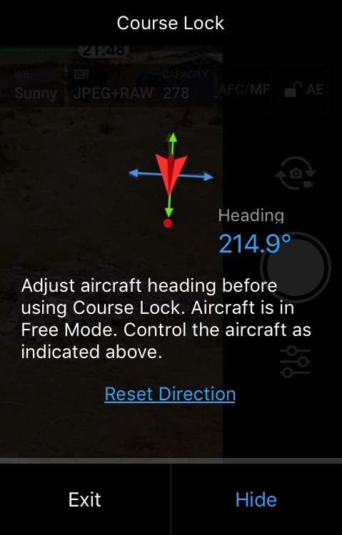 If you’d like to change the locked direction, the “Reset Direction” button is your friend. I started out in this situation - flying with one course locked, and the nose of the Mavic Pro 90 degrees to the left of my locked course.