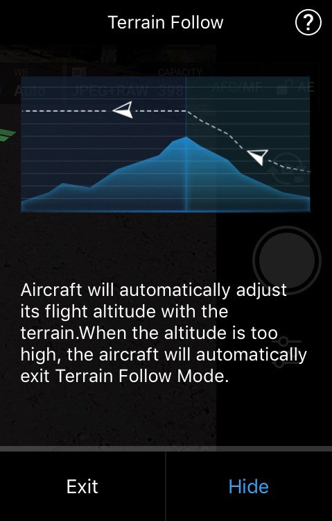 Another Intelligent Flight Mode you can use is Terrain Follow. This mode uses the downward facing sensors to detect the distance from the ground, and allows you to set a new minimum AGL (Above Ground Level) altitude for flight. If the ground rises up, the drone will rise up to maintain that minimum clearance. It doesn’t automatically descend if the ground falls away, but you can pull down on the left stick to descend back to that minimum altitude (unlike normal flight modes, holding it down does not cause the Mavic Pro to land - it will just hover at the programmed AGL distance).
