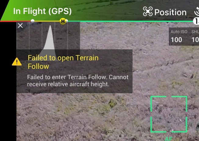 In my testing, Terrain Follow only works up to around 25 feet - maybe a bit higher. If you try to engage it when you’re too high, you’ll see the following error - and it won’t engage.