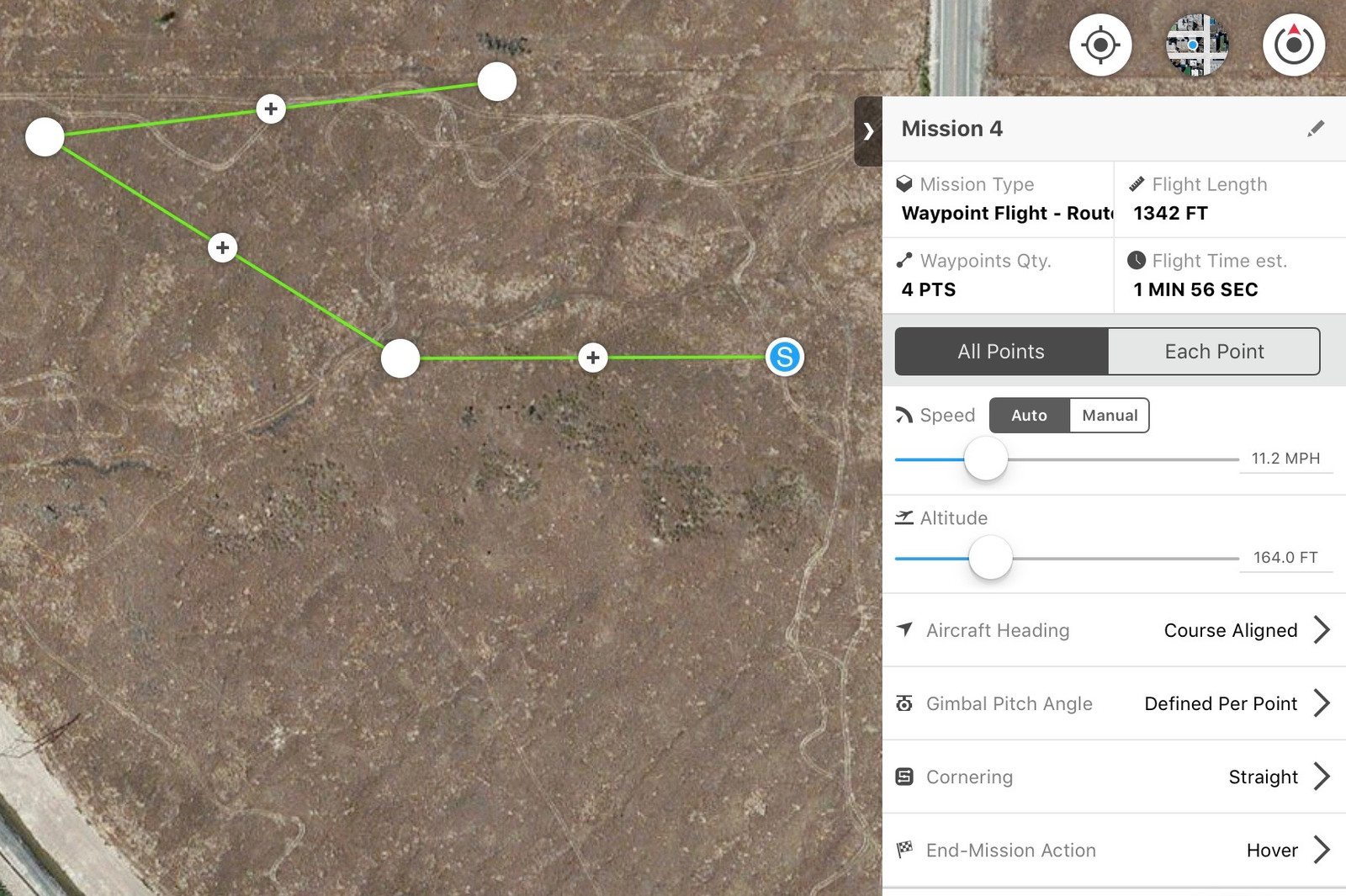 Since you can’t plan a route ahead of time, there’s also no way to say, “I want to get photo coverage of this property, you figure out the details.” Since the app can’t take photos or manage the gimbal anyway, there’s no real loss here - but it’s something other apps offer.