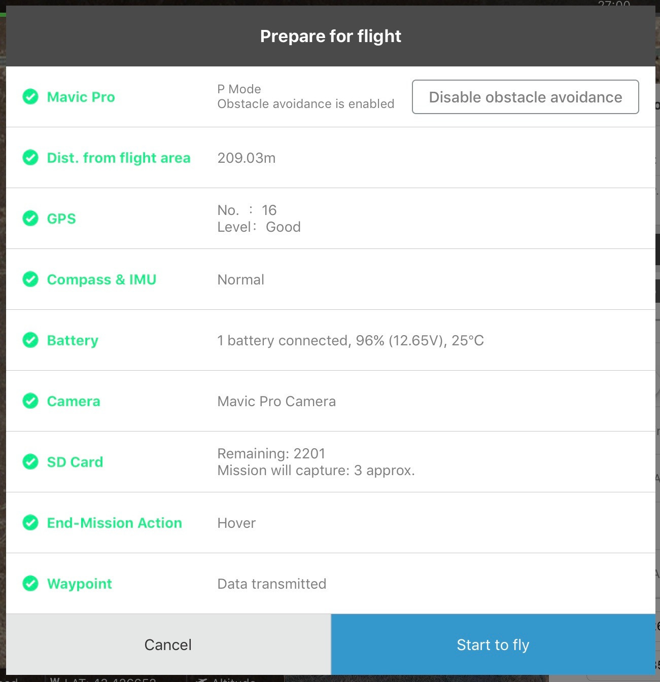 Ground Station Pro has some automatic takeoff features, but I normally fly off the ground manually and then let GS Pro take over once I’m in the air. Load the mission you want to fly, and click the little “airplane/fly” button in the top right (because labeling buttons is sooo 2010…), and you should get a preflight status screen. If you’re doing filming, and you know the route is clear, I would disable obstacle avoidance - it serves no real purpose on a predefined course that you’ve checked out, and I do occasionally get clear air detected as obstacles in flight. I suspect it’s either my sun shield or sun glinting off the forward facing obstacle detection cameras. But turning it off will prevent a sudden stop in the middle of a run.